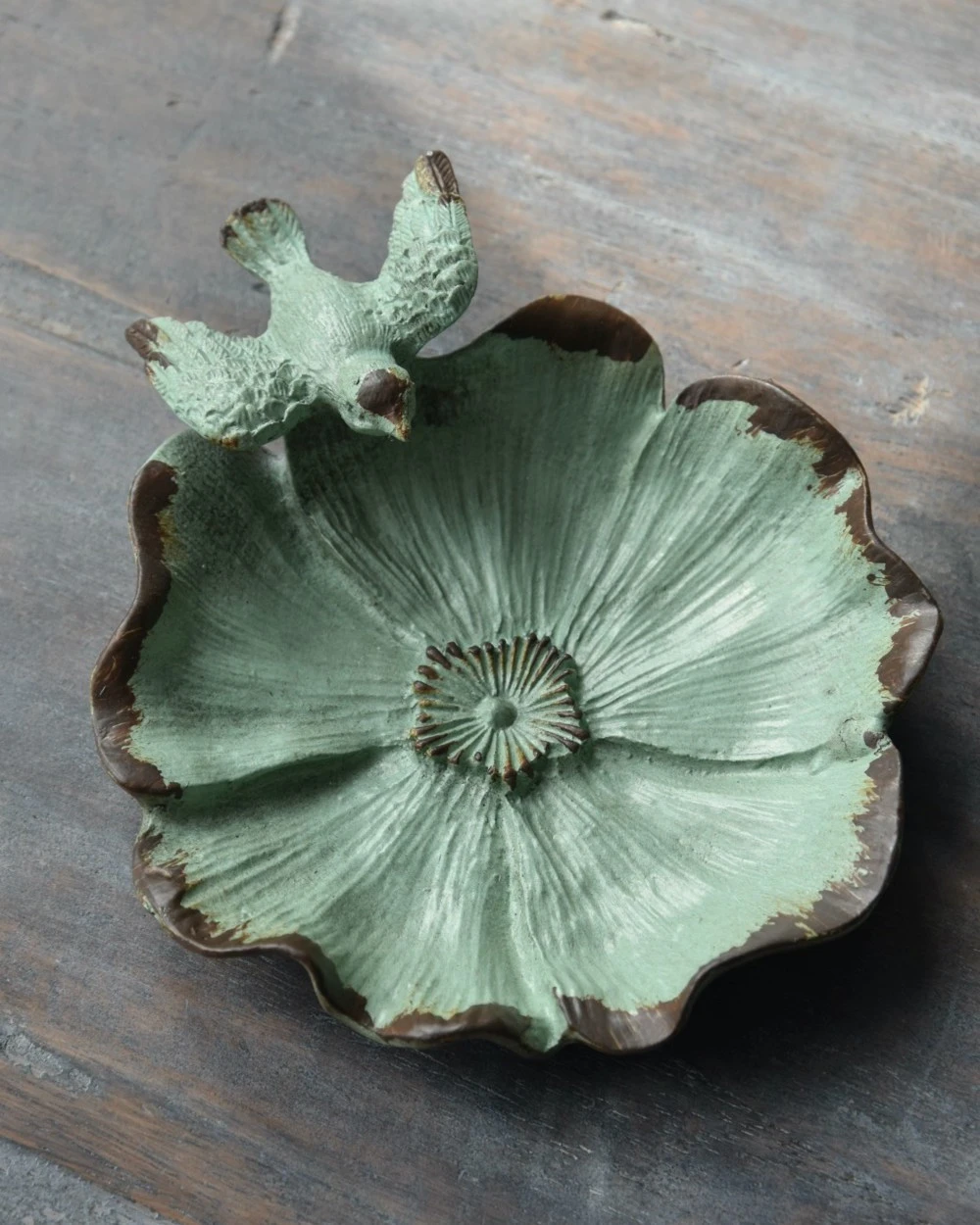 Bloemvorm antiek turkoois schaaltje met vogeltje per stuk. Dit mooi gevormde schaaltje van metaal met een antieke turkoois afwerking is een bloem met een vogeltje op de rand. Het schaaltje is al sierlijk genoeg om zo neergezet te worden. U kunt het bijvoorbeeld gebruiken als sieraden schaaltje op de kaptafel of voor de sleutels……