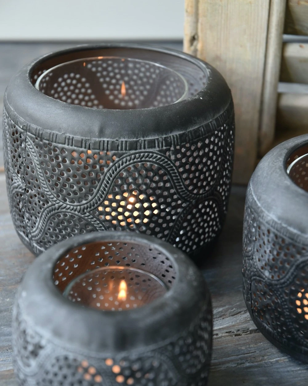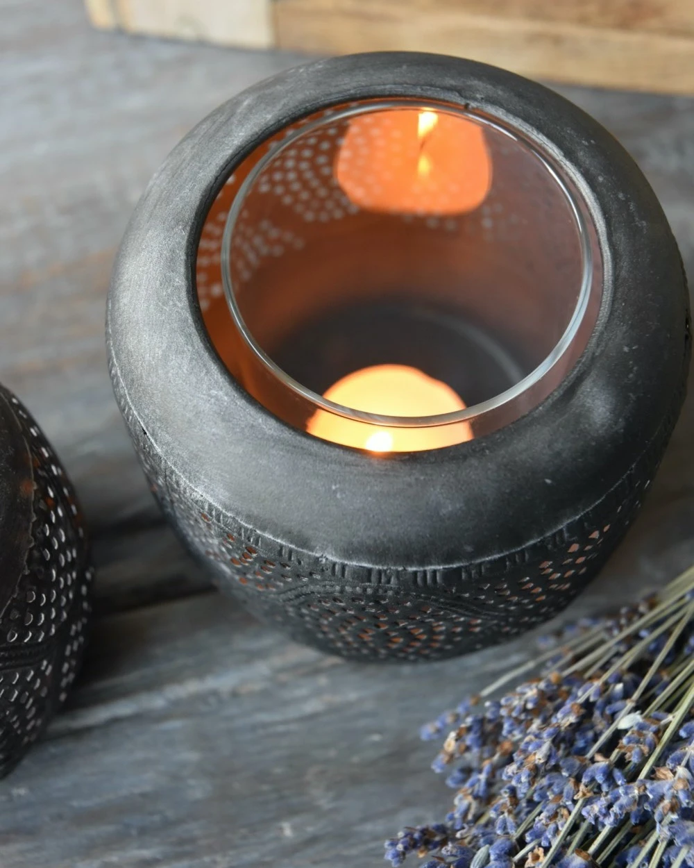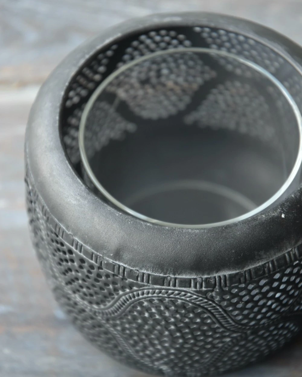 Bol windlicht met golvend rond gaatjes patroon, groot. Dit leuke windlicht is van metaal gemaakt met daarin een glas om de kaarsje veilig te kunnen branden. Het windlicht is donker met wat lichtere accenten die het mooie gaatjes patroon aangeven met zijn sierlijk golvende lijnen. Het windlicht is iets bol en in drie maten verkrijgbaar, waarvan dit de grootste maat is.Â