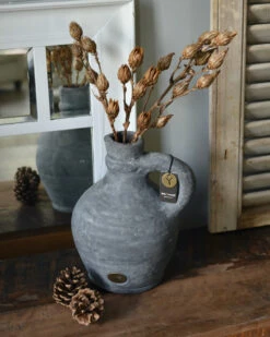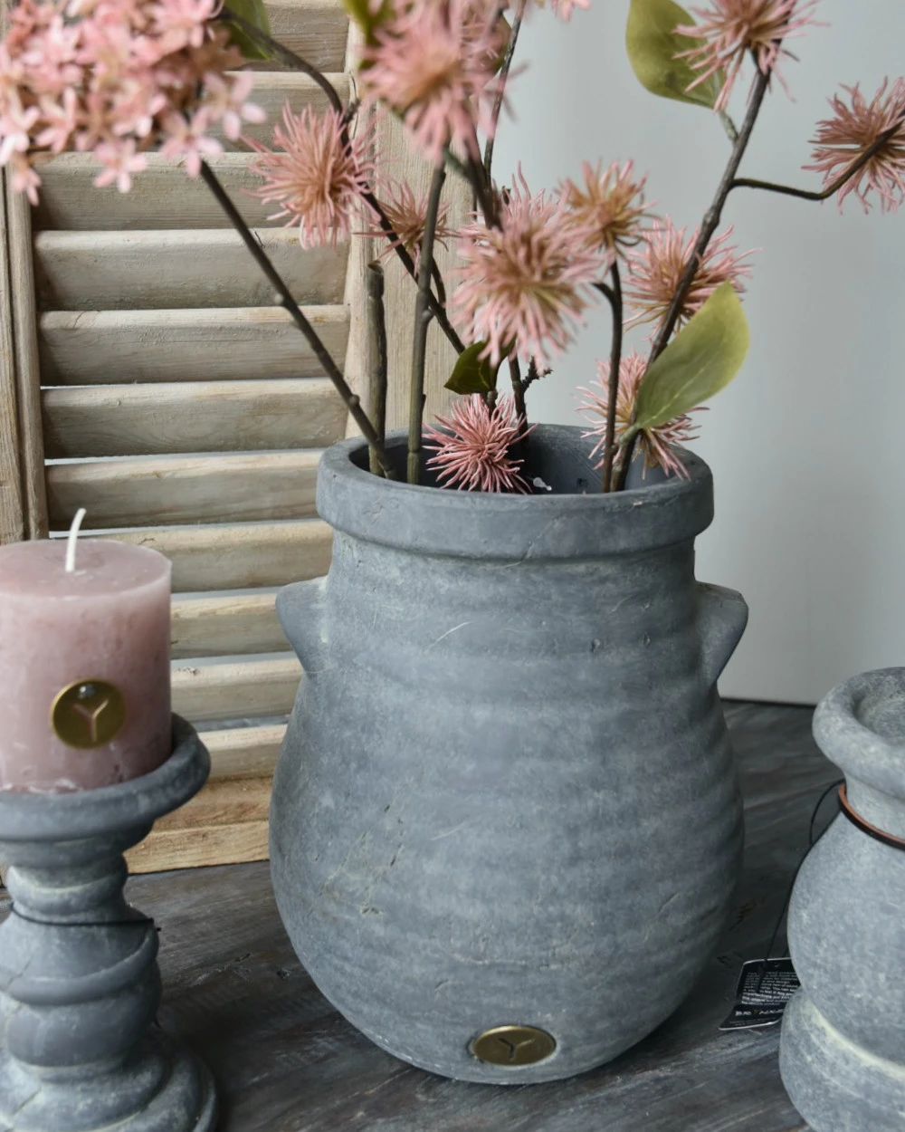Bolle vaas met ribbel reliëf en dichte oortjes Majestic, Brynxz. Deze mooie vaas/pot heeft een elegant model met een grof ribbel reliëf, een dikke kraag en twee dicht oortjes. De pot is van aardewerk en heeft een Majestic vintage afwerking, aan de voorzijde zit het Brynxz logo in de pot verwerkt. U kunt de pot als vaas met zijde bloemen of als pot met bv een mooie hangplant decoreren. De vaas/pot is niet 100% waterdicht, we adviseren om altijd een binnen vaas/pot of plastic te gebruiken.