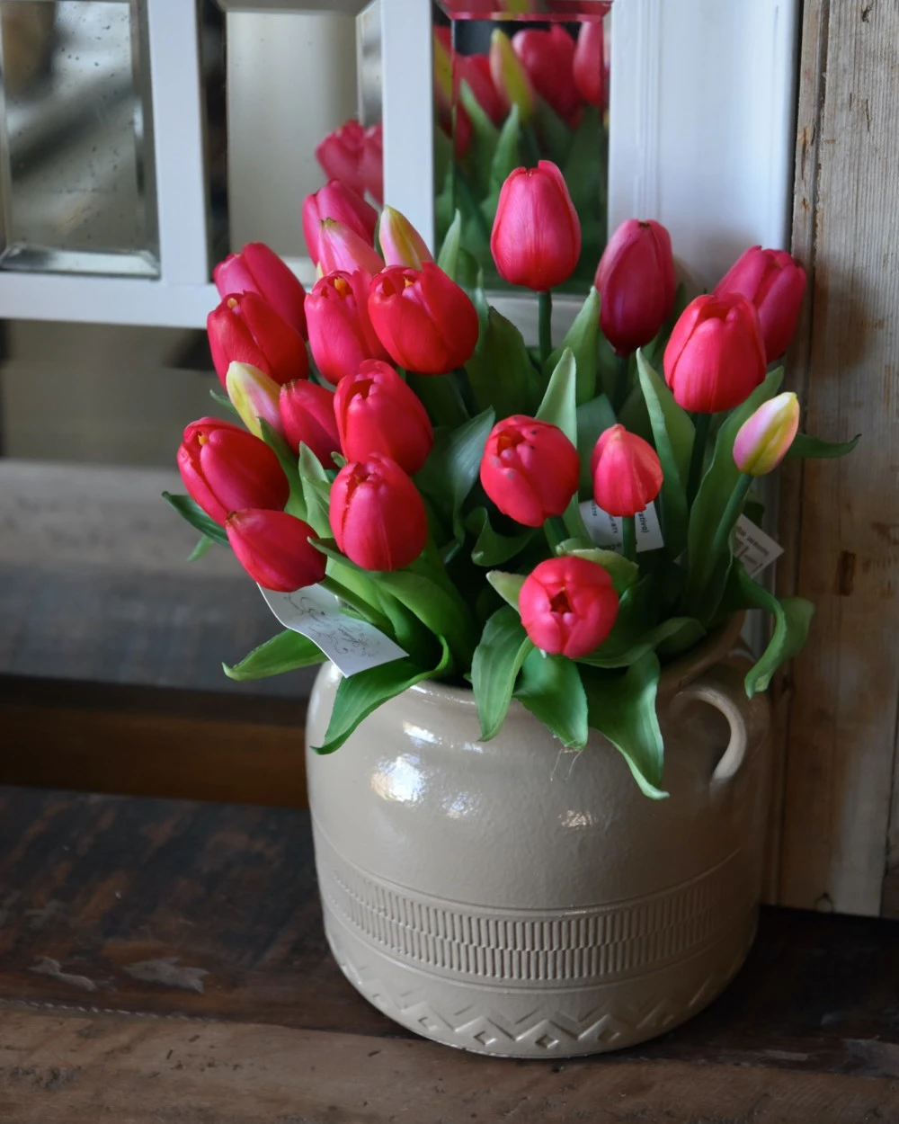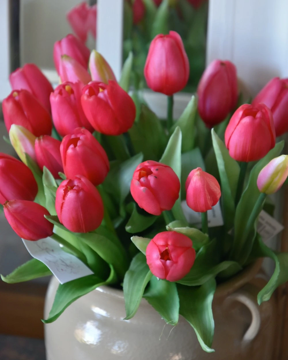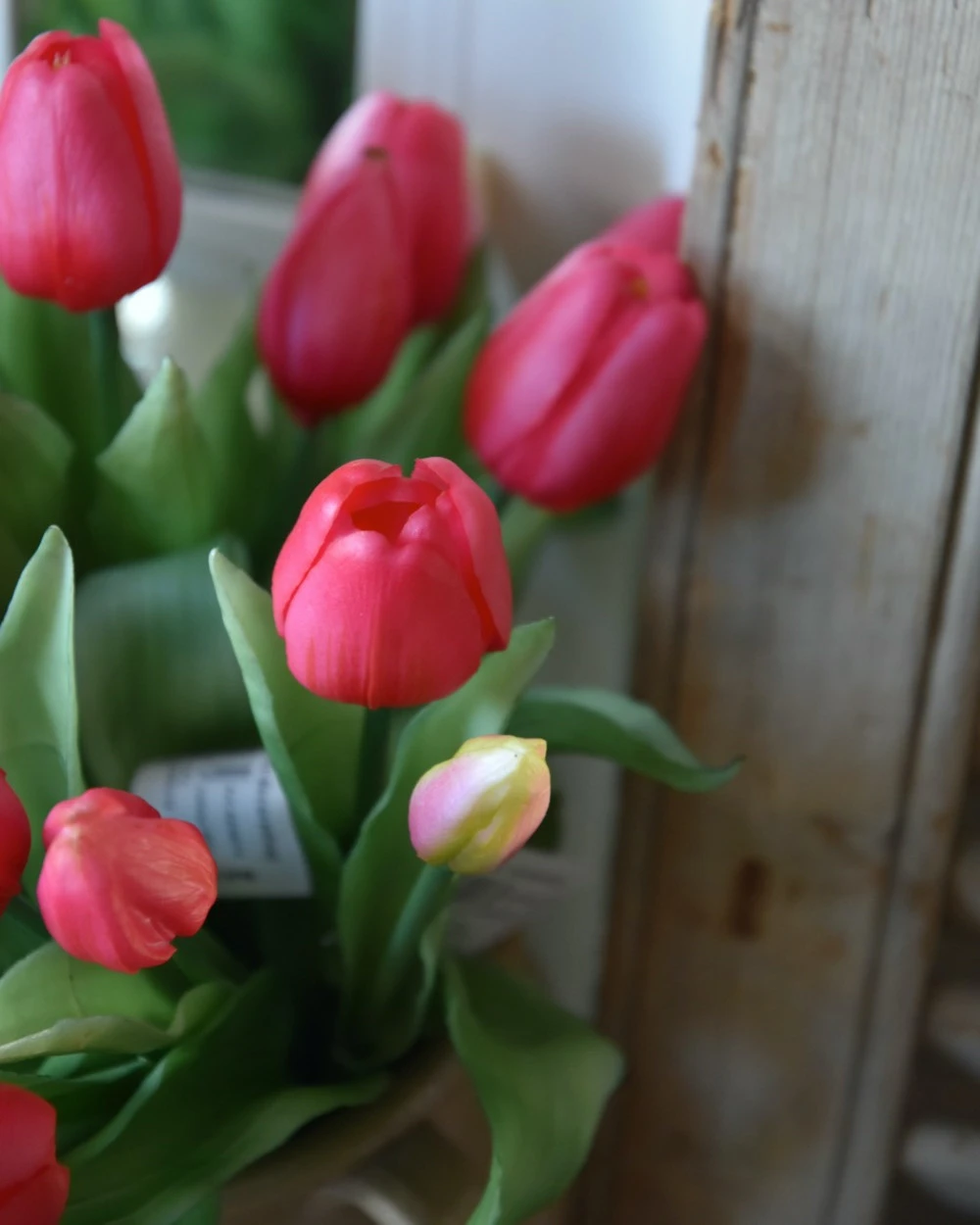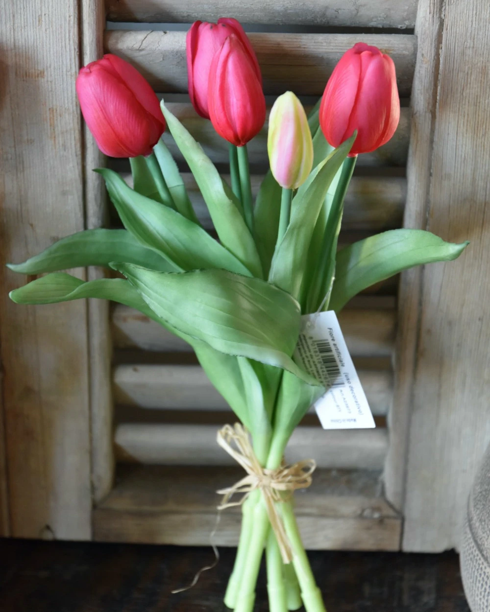 Bos diep roze tulpen real touch, a 5 stuks. Deze prachtige zijde/kunst tulpen hebben een intens diep roze kleur. De real touch tulpen voelen bijna echt, en zijn ook vrij zwaar (zoals echte tulpen ook zijn). De bos tulpen is zoals in de natuur net in verschillende stadia van bloei. U kunt de tulpen zo op een vaasje zetten en lang genieten van deze mooie voorjaarsbloeier.Â