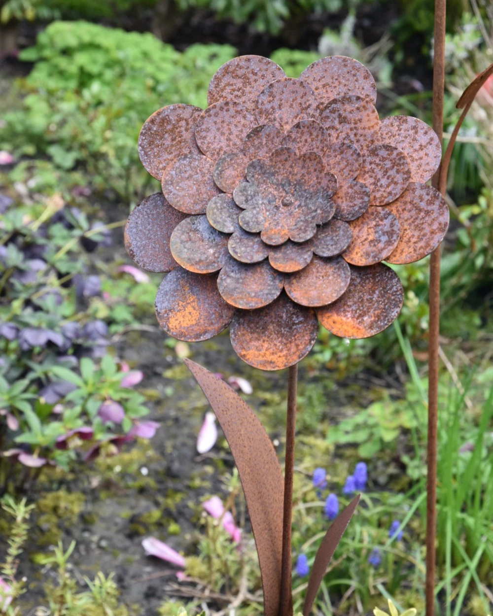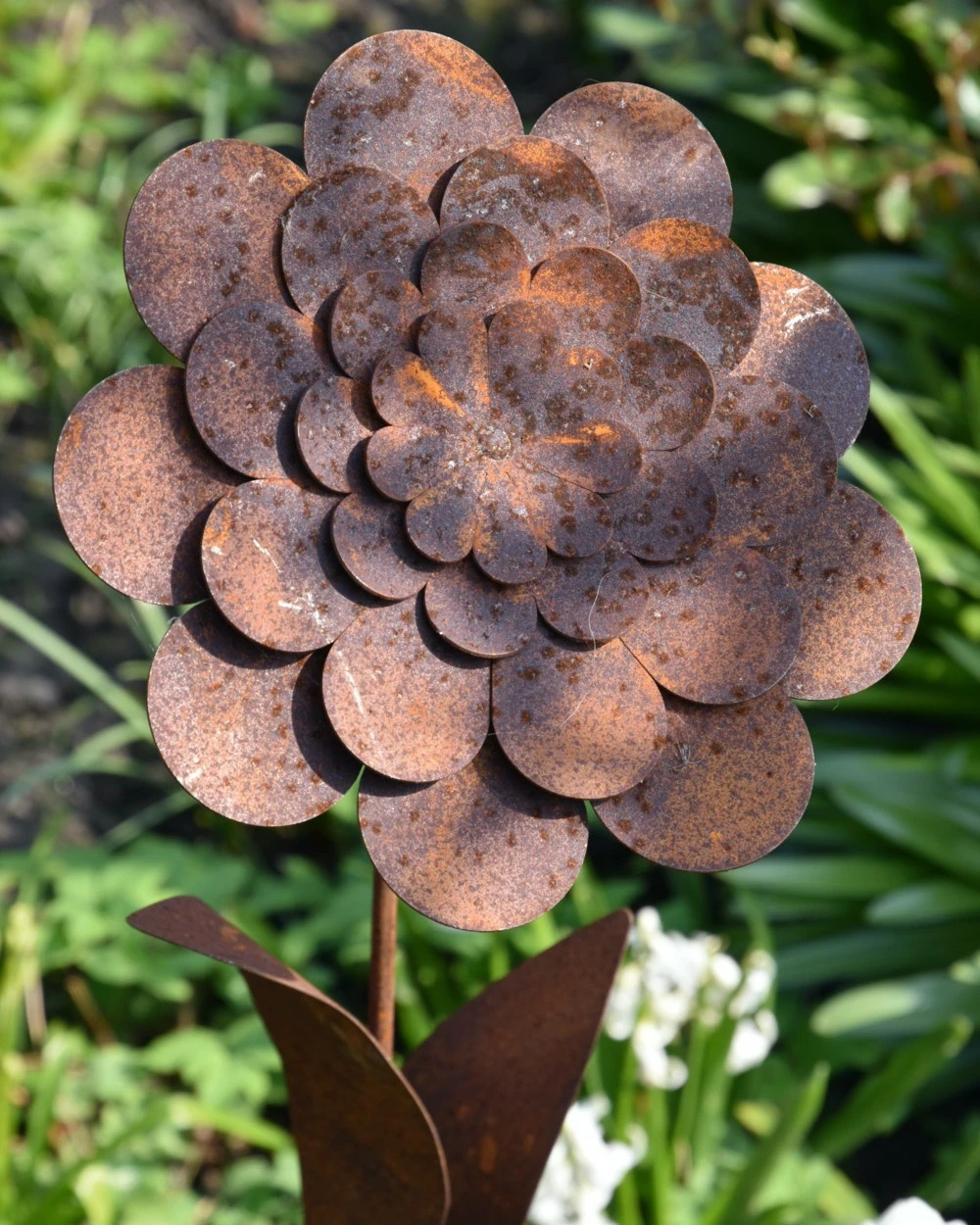 Ecoroest tuinprikker Dahlia. Deze mooie gevilde bloem van de Dahlia heeft ronde blaadjes die naar binnen toe steeds compacter worden. De ecoroest tuinprikker staat op een lange steel met bladeren die zo in de tuin tussen de beplanting kan worden gezet. De Dahlia kan ook heel mooi worden gecombineerd met andere ecoroest bloemen waar u het gehele jaar van kunt genieten in de tuin.