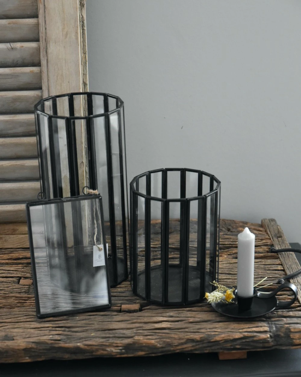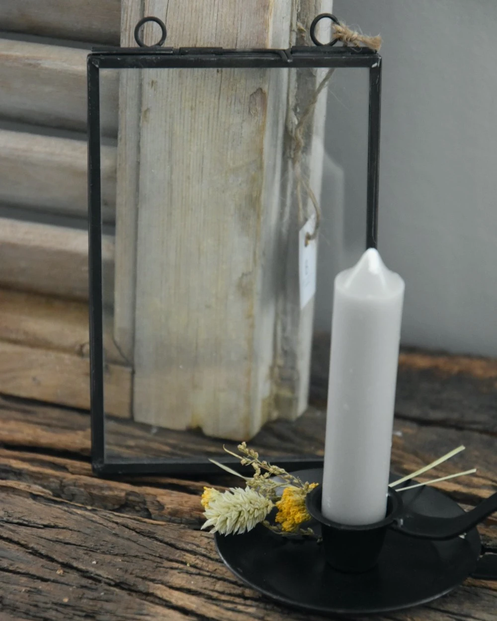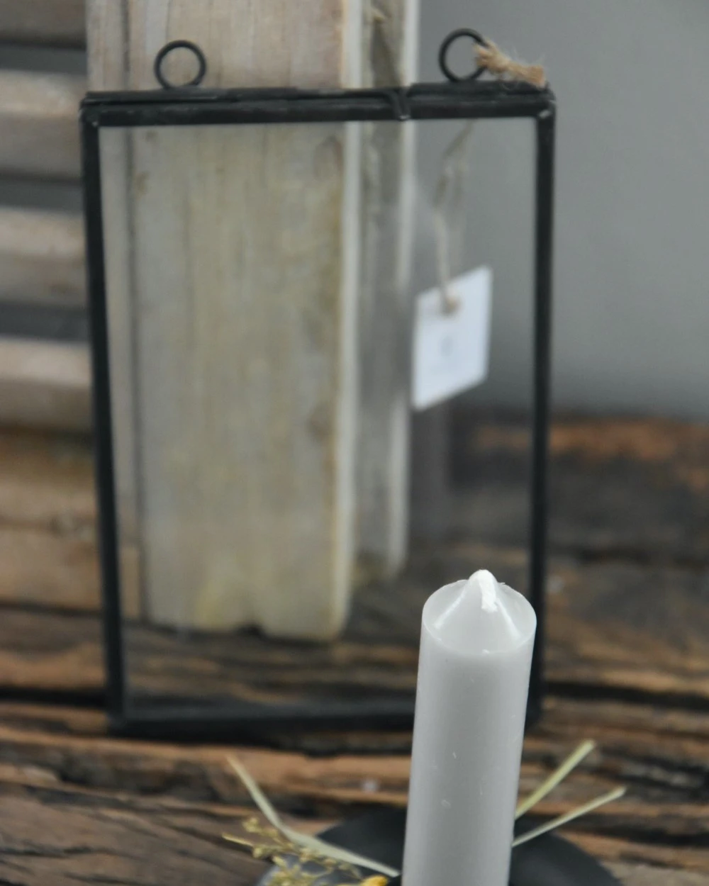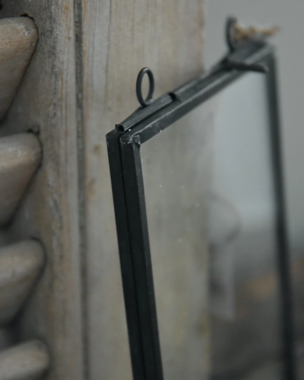 Fotolijstje glas in metaal met ophang oogjes per stuk. Deze mooie lijst heeft een donkere kleur en een fijne rand met dubbel glas voor een mooi effect. U kunt het lijstje op een rekje tegen de muur plaatsen of ophangen aan de ophang oogjes met touw, of een kettinkje,……. De lijst past heel mooi op metalen decoratie plank van IB Laursen.Â