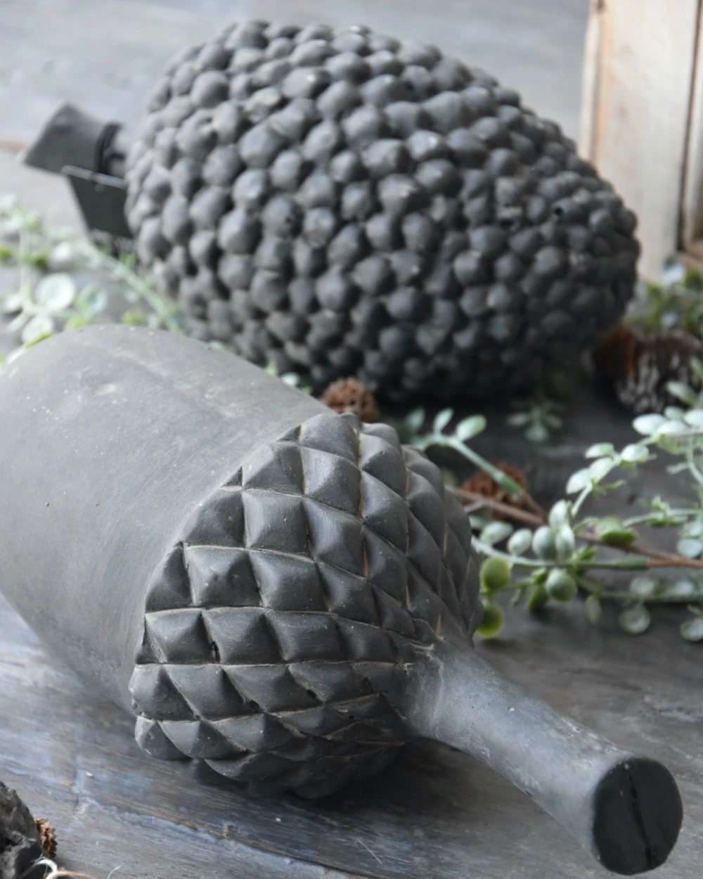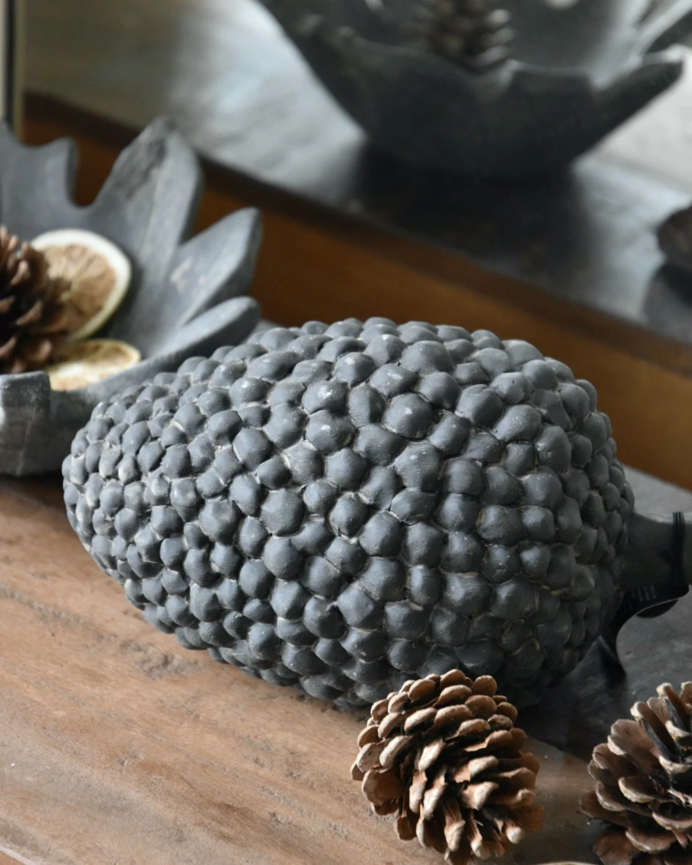 Grote aardewerk Pine cone/Kegel van Brynxz. Deze leuke decoratieve aardewerk kegel heeft een donker klei kleurige grijzige afwerking en een prachtige vorm. U kunt de Pine cone op allerlei manieren decoreren en combineren. Op een grote schaal op de tafel of in de boekenkast….., samen met de grote eikel en aangevuld met wat kleinere, een tak en wat groen, leuke gekleurde bladeren of kaarsen….. De kegel is heel zwaar en heeft een plat onderkantje waarop hij gemakkelijk blijft liggen.