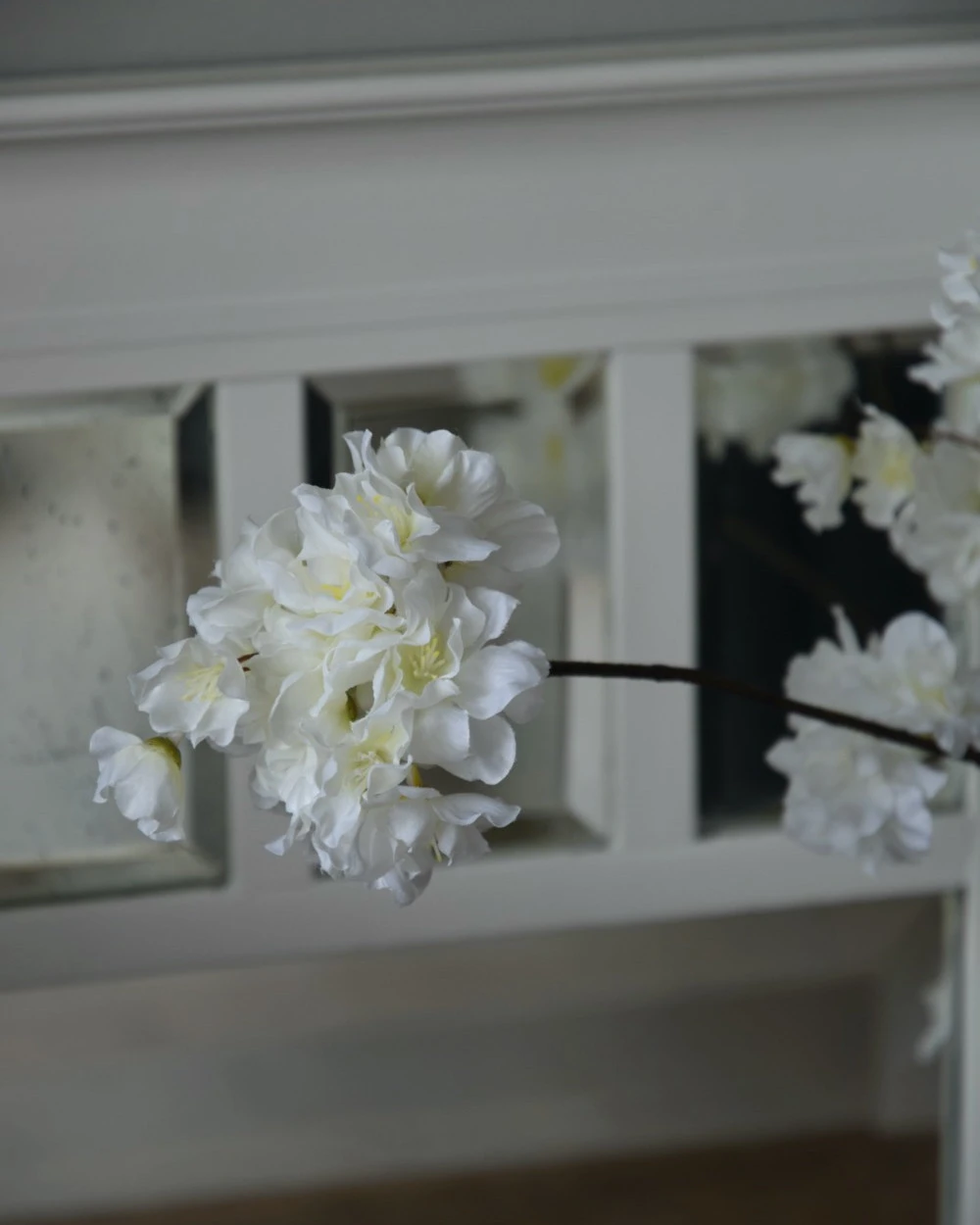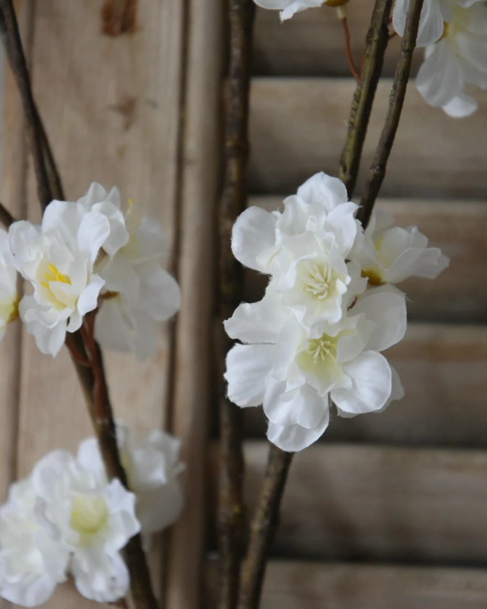 Grote bloesem tak met weelderige witte trossen bloemen. Deze prachtige grote bloesem tak is mooi vertakt en heeft heel veel trossen met witte bloesem bloemen. De tak valt al erg mooi door alle vertakkingen en kan nog naar wens iets in de voor u juiste positie worden gebogen. U kunt de tak op een mooi hoge fles/vaas of kruik bijvoorbeeld zetten en er zo heel lang van genieten. Doordat de bloesemtak zo lang is kan het zijn dat wij in het onderste gedeelte de tak gebogen versturen.