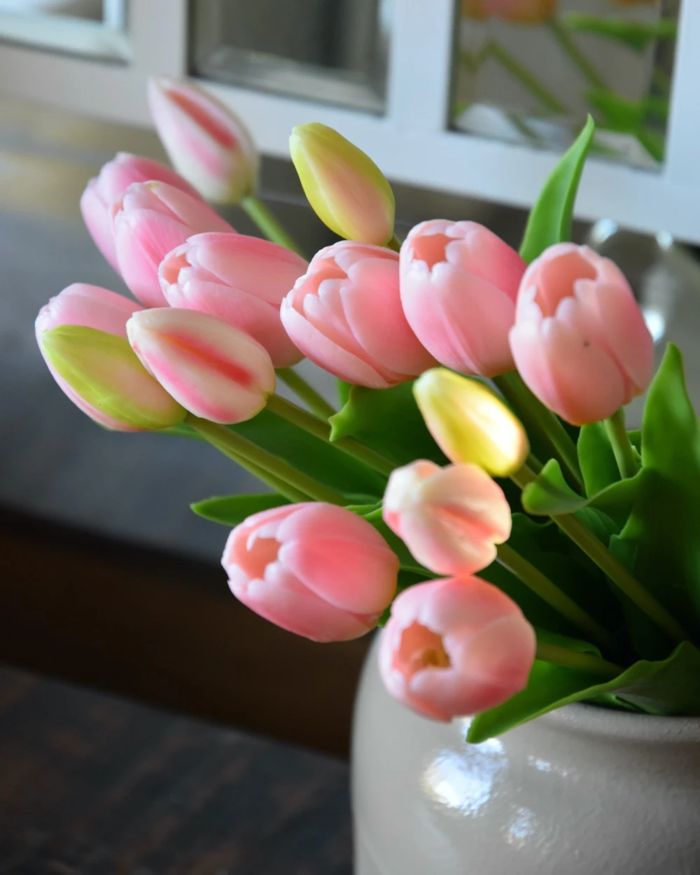 Hollandse roze tulpen bos a 5 stuks. Deze prachtige zijde/kunst tulpen hebben een zacht roze kleur. De tulpen zijn in verschillende stadia van bloei en zijn in de echte Hollandse typerende vorm. De tulpen en het blad voelen vrij echt aan en u kan de tulpen direct gezellig op een vaasje zetten en zo het voorjaar in huis halen. Tip, u kunt de tulpen ook leuk mengen met andere kleuren tulpen.