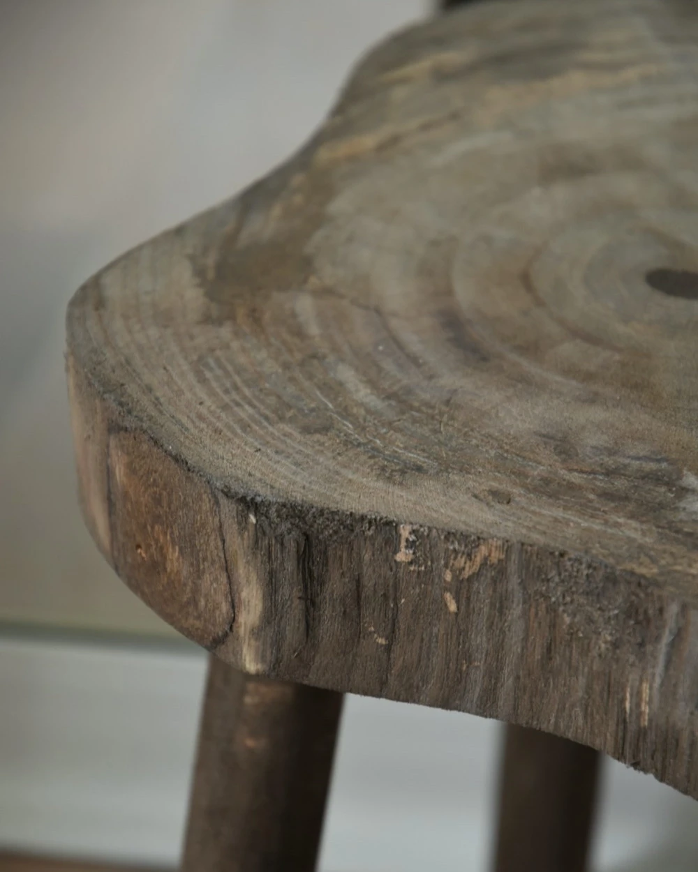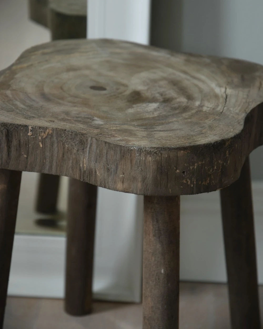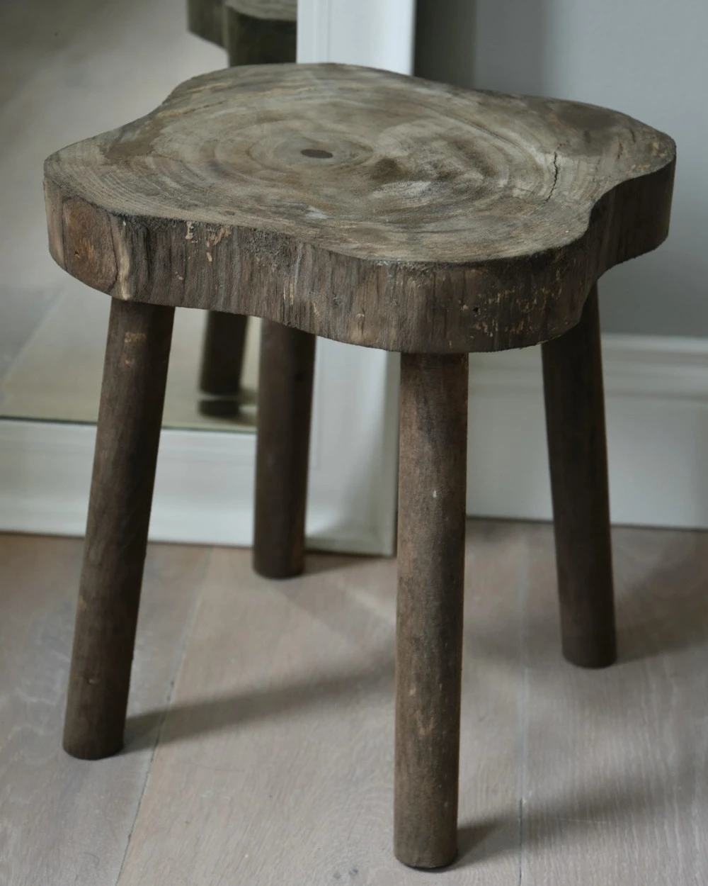 Houten kruk met golvend blad. Dit leuke houten decoratie krukje heeft 4 ronde poten en een golvend blad waar dan ook de jaarringen van de boom zichtbaar zijn. Het hout is bruin van kleur en iedere kruk is uniek doordat het blad een plak van een boom is…. U kunt de kruk als decoratie neerzetten met bv een mooi windlicht of grote pot met een plant….