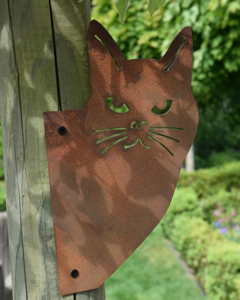 Kat hoekjes gluurder, metalen tuin decoratie. Deze leuke kattenkop komt zo om de hoek gluren. De metalen silhouet kat heeft een mooi roestlaag en kan aan de paal van de schutting op van het schuurtje worden geschroefd zodat hij altijd gezellig mee kan gluren….. Er zijn twee gaatjes aanwezig zodat u er gemakkelijk een schroef/spijker in kunt zetten, er zijn geen schroeven meegeleverd. U kunt de kat zowel naar links als rechts om de hoek laten kijken.Â