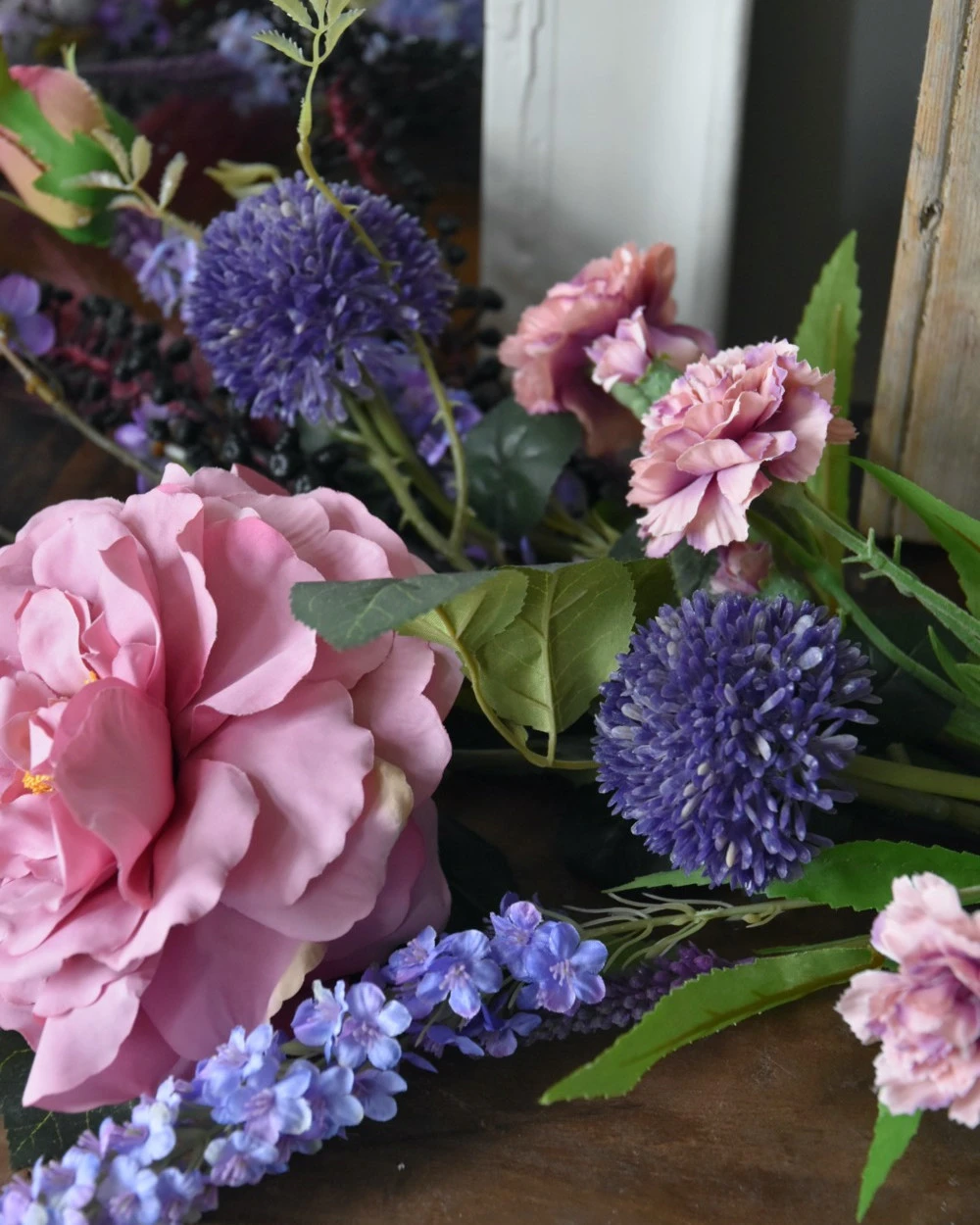 Lila paars zijde pluk boeket met tuinroos, Allium en bloesem. Dit prachtige zijde/kunst boeket in ton sur ton tinten lila en paars, heeft een enorme gevulde tuinroos in het lila, een violet bloesemtak, Sangria kleurige grassen, blauw violet kleurige Allium, Orchidee kleurige Veronica, Lila/violet kleurige Anjers en een prachtige Karmozijn bessen tak. U kunt het boeket zo op een grote fles zetten of een vaas met een smalle hals. Het boeket is ook erg mooi om cadeau te geven. We houden de stelen van het boeket graag op de maximale lengte zodat u nog alle kanten op kunt. Het kan zijn dat wij i.v.m. vervoer en verpakking de onderkant van de stelen buigen.Â