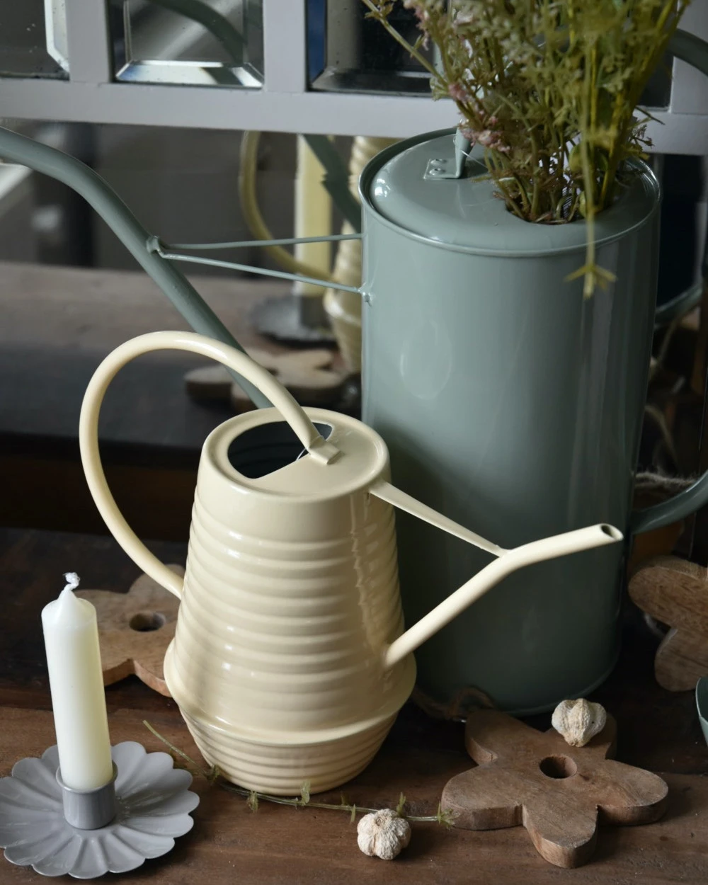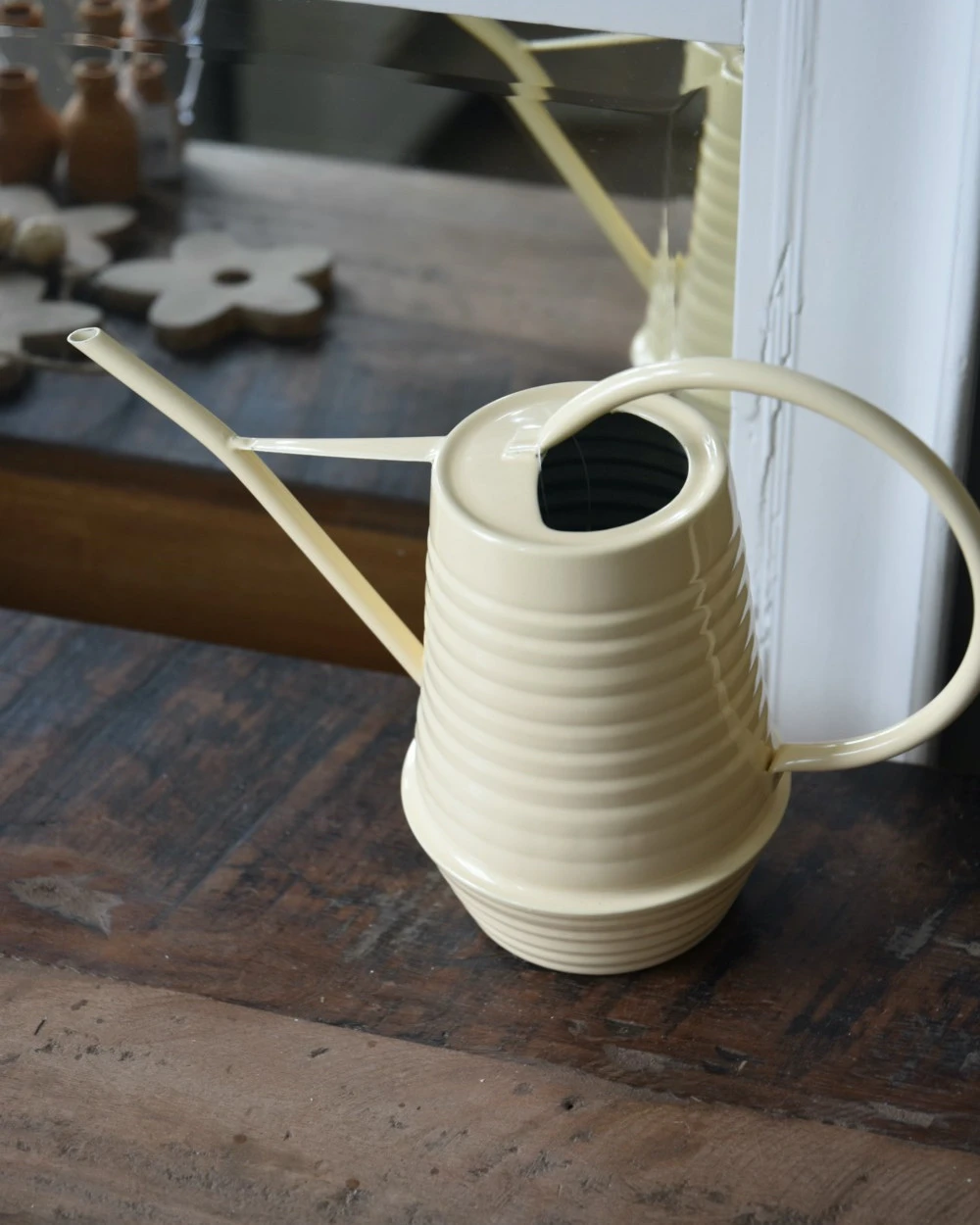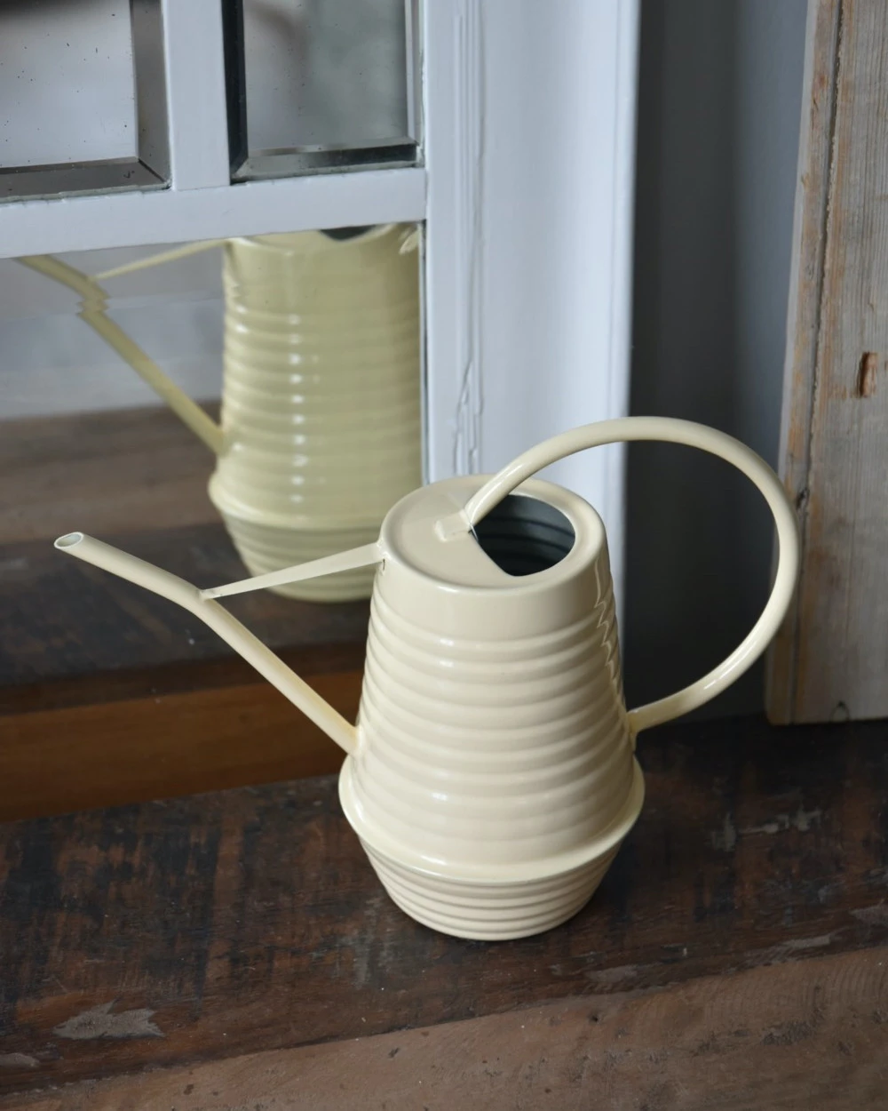 Metalen gieter in zacht geel 0.95 liter, IB laursen. Deze leuke kleine gieter is van metaal met een zacht gele kleur in een erg leuk model waar een lijnenspel in verwerkt zit. De gieter heeft een smal groot handvat en een smalle water tuit. U kunt de gieter ook gemakkelijk binnen gebruiken voor de kamerplanten. Ook is het leuk om er wat bloementakken in te zetten bijvoorbeeld. Tip, laat nadat u de planten water gegeven heeft geen water in de gieter staan, zo voorkomt u roest, algen-groei en bacterie-groei.Â