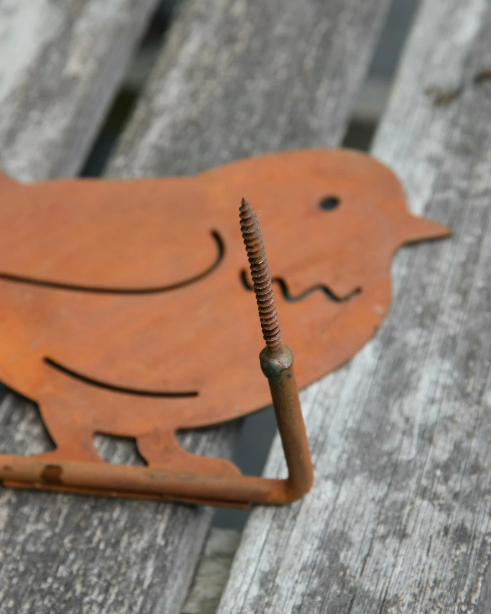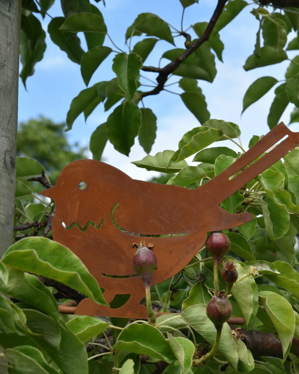 Metalen tuin vogel Mus op takje. Deze schroef vogel het Musje zit op een tak/stokje, de Mus is in een mooi silhouet en kan met de schroef zo in een boompaal of schutting bv worden geschroefd. Zo heeft u altijd een leuk vogeltje in de tuin in een warme roestkleur. Het stokje/takje gaat om de hoek zodat u een leuk 3D effect heeft waar het vogeltje geplaatst wordt.Â