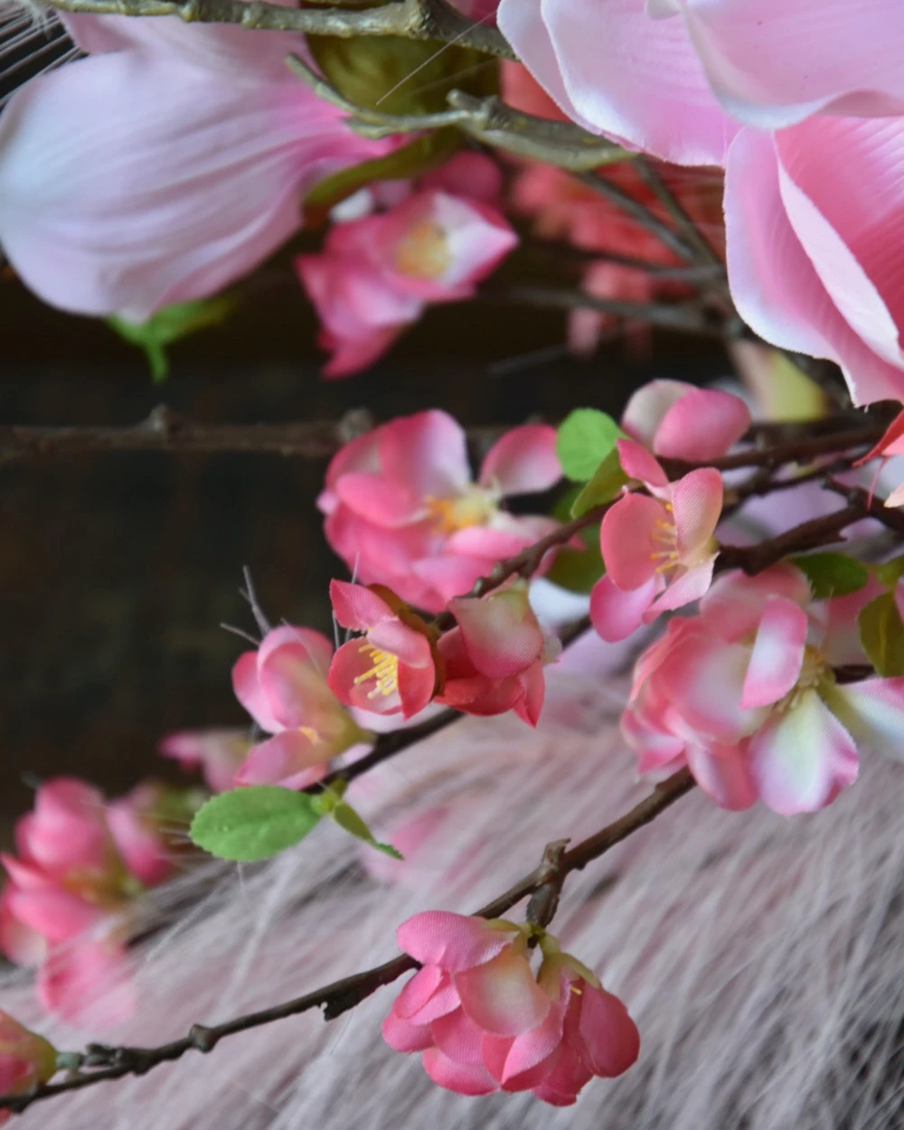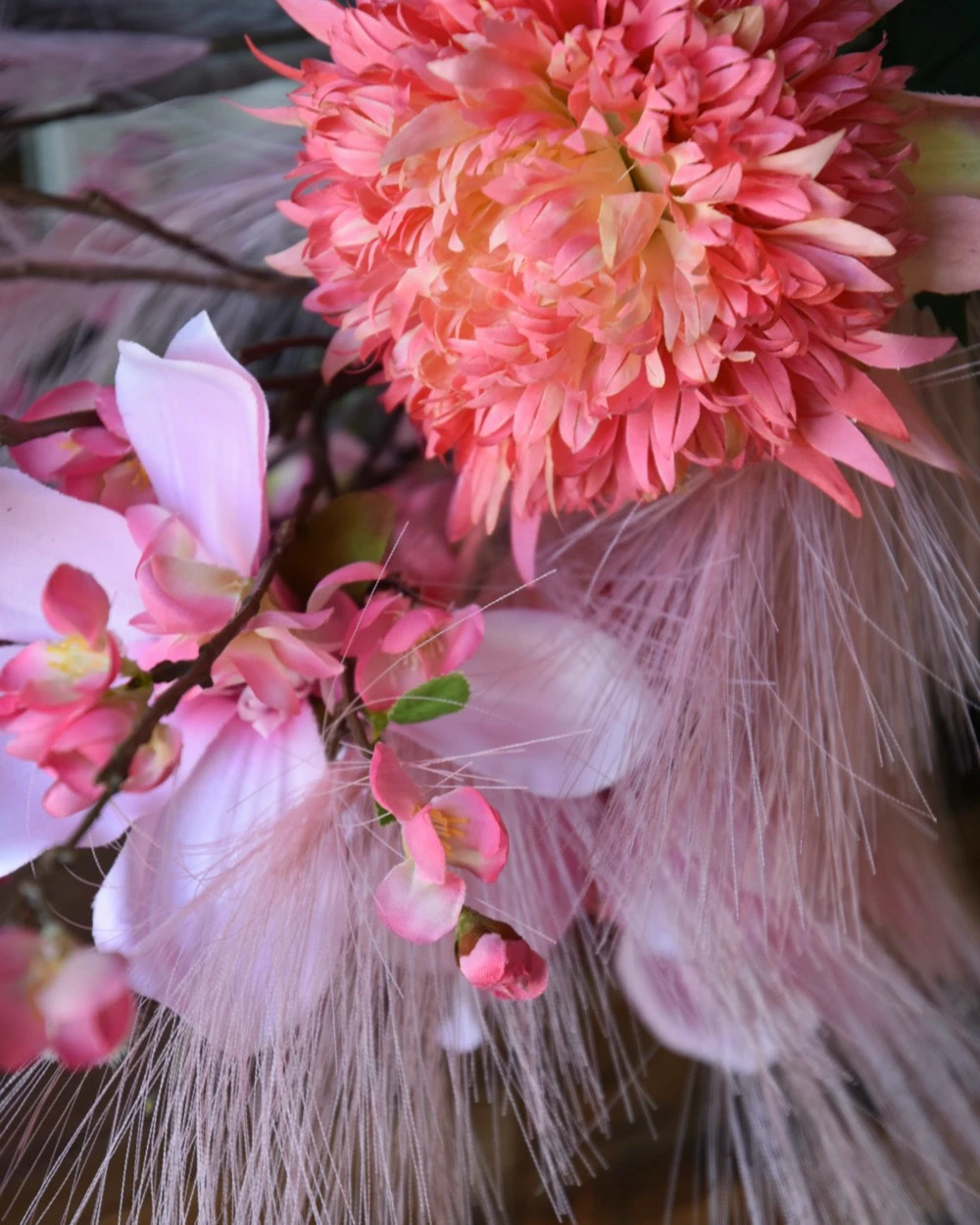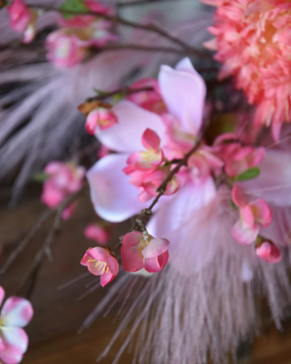 Pluk boeket in het roze met Magnolia, Kersenbloesem, pluimen en Papaver. Dit prachtige boeket met verschillende roze bloemen is van zijde/kunst bloemen gemaakt. Het boeket met Kersenbloesem, Magnolia, Roze pluimen en grote gevulde Papaver/Klaproos bloemen het verschillende tinten roze die elkaar versterken. U kunt het boeket zo op een lange fles vaas zetten bijvoorbeeld. Het boeket is vrij lang, mar kan altijd met een tang op maat worden geknipt of u kunt de onderkant van de stelen buigen om hem op de voor u juiste lengte te knippen. Het kan zijn dat wij de onderkant van de stelen iets buigen voor vervoer.