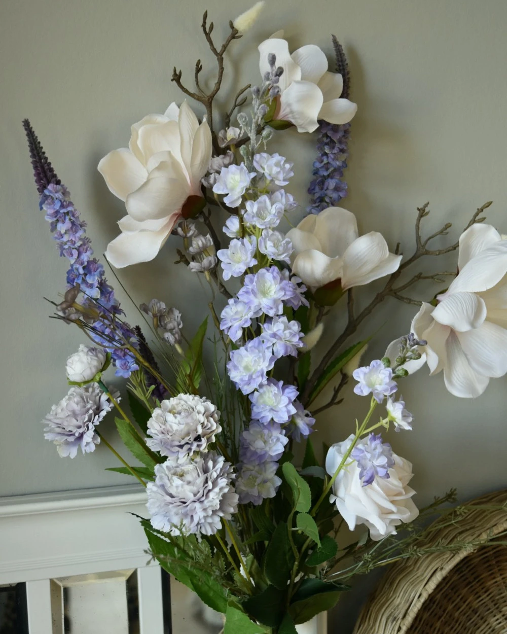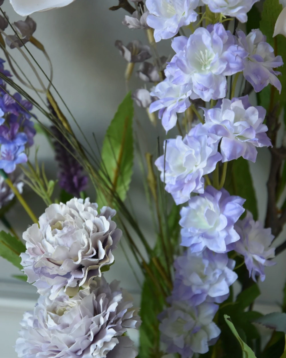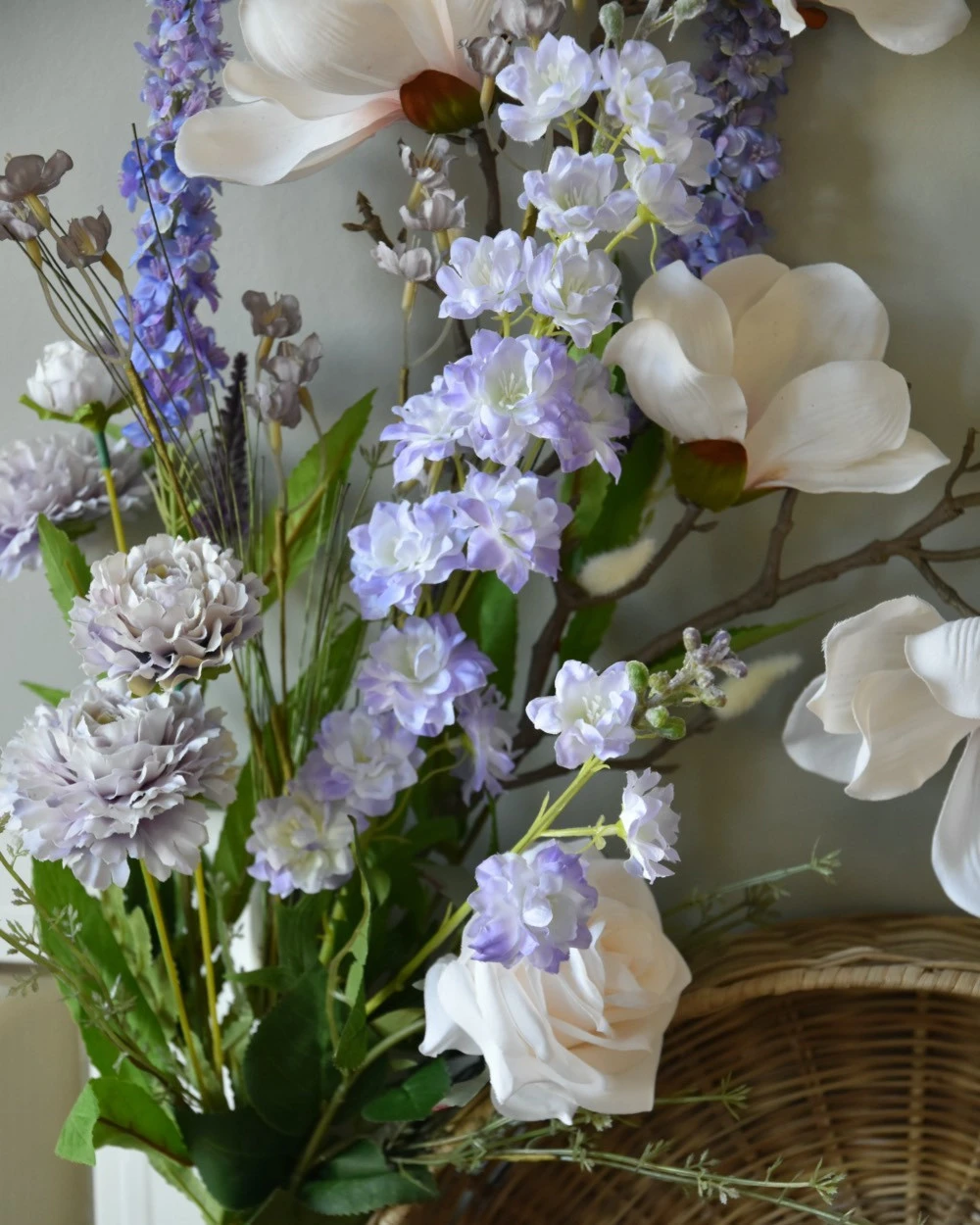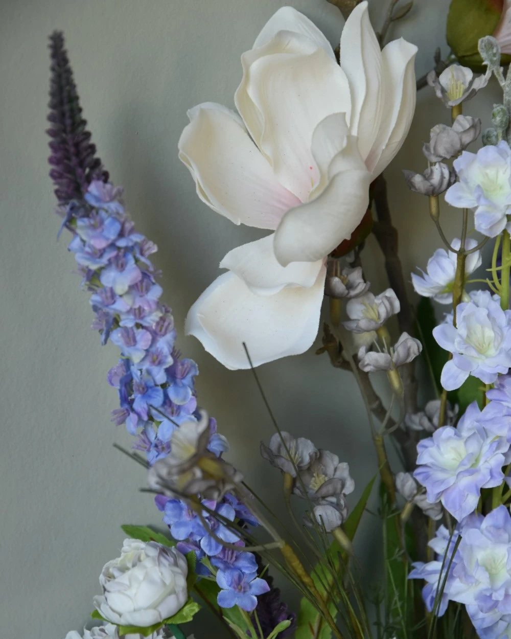 Pluk boeket zijde in zacht violet en poeder roze/wit. Dit plukboeket van zijde/kunst bloemen in mooie zachte tinten is eenzijdig opgemaakt. Het boeket is gemaakt met o.a. Magnolia, Veronica, Delphinium, dubbele Zinnia’s, een roos en fijne violet kleurige bloemetjes met groen. De prachtige zachte tinten violet passen heel mooi bij de bijna witte bloemen die iets poeder roze over zich hebben. Het boeket kan op een mooie flesvaas worden gezet bijvoorbeeld. U kunt uiteraard het boeket met een tangetje op de juiste lengte knippen of buigen, Het kan zijn dat wij de onderkant van de stelen buigen voor vervoer.