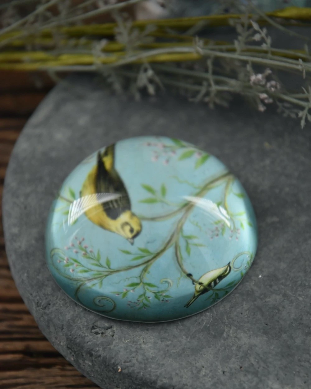 Presse papier met vogels op tak in pastel blauw per stuk. Deze prachtige brocante halve glazen bol heeft een mooie pastel kleurige afbeelding van vogels in een tak. De zware decoratieve bol kan heel goed worden gebruikt om papier bv op zijn plek te houden, maar staat ook prachtig op een bijzettafeltje of in de boekenkast.