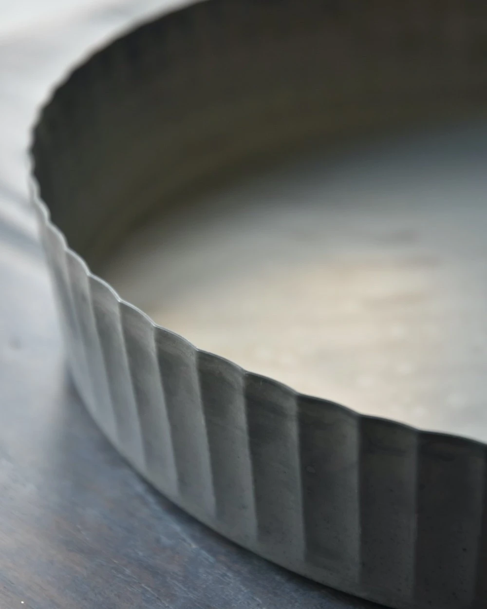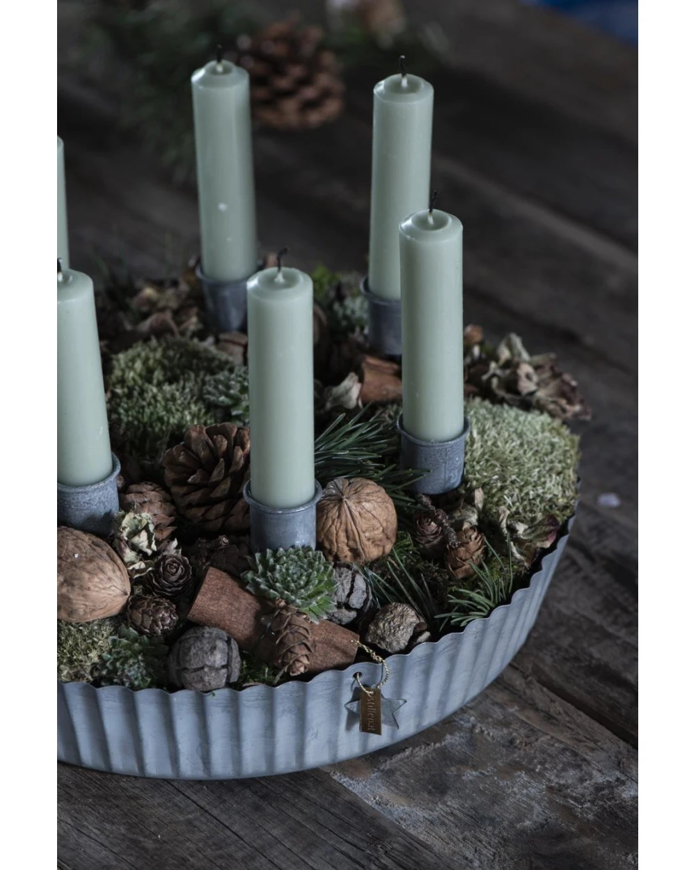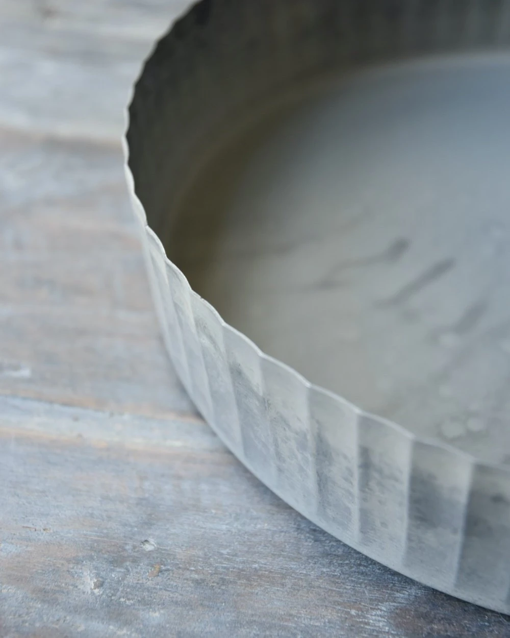 Ronde zinken schaal met hoge schulp rand, IB Laursen. Deze grote ronde schaal heeft platte bodem, een mooie hoge schulp rand en is in het zink grijs. De schaal past eigelijk overal bij en kan op heel veel manieren worden gedecoreerd. Zo kunt u hem als kaarsen plateau gebruiken, met potjes en kandelaren, Met vetplanten en schelpen, met mooie gedroogde vruchten en een groene rank, met kerstballen,………Â