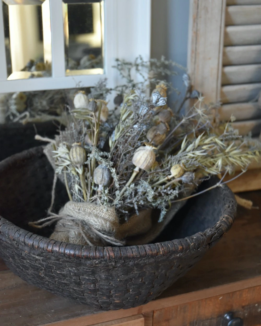 Sobere droogbloem toef in oude leemmand. Deze prachtige oude leemmand compleet met een sobere droogbloemen toef in sobere woonstijl, kunt u zo neerzetten. De toef is opgemaakt met Wilde Asparagus, Papavers, Stoebe, Tijm, Haver, Disteltjes en Eucalyptus vruchten en afgewerkt met een grove jute lap. U kunt de mand op een mooi plekje op tafel of een lage kast zetten bijvoorbeeld. De prachtige leemmand is echt oud en laat dit in kleine gebreken zien waardoor het geheel vol karakter is.