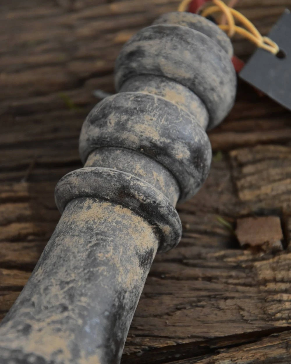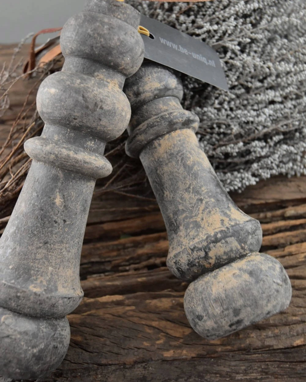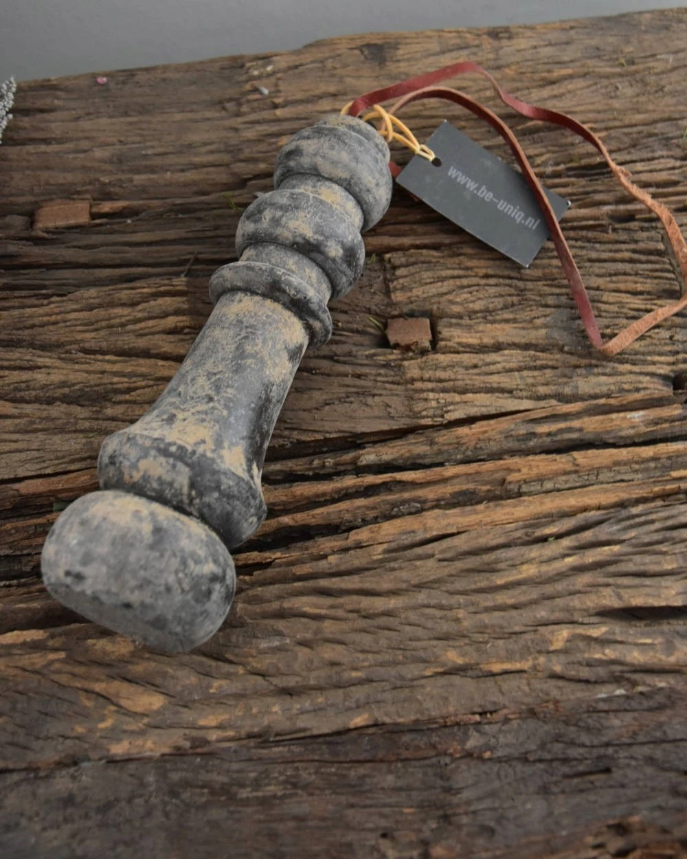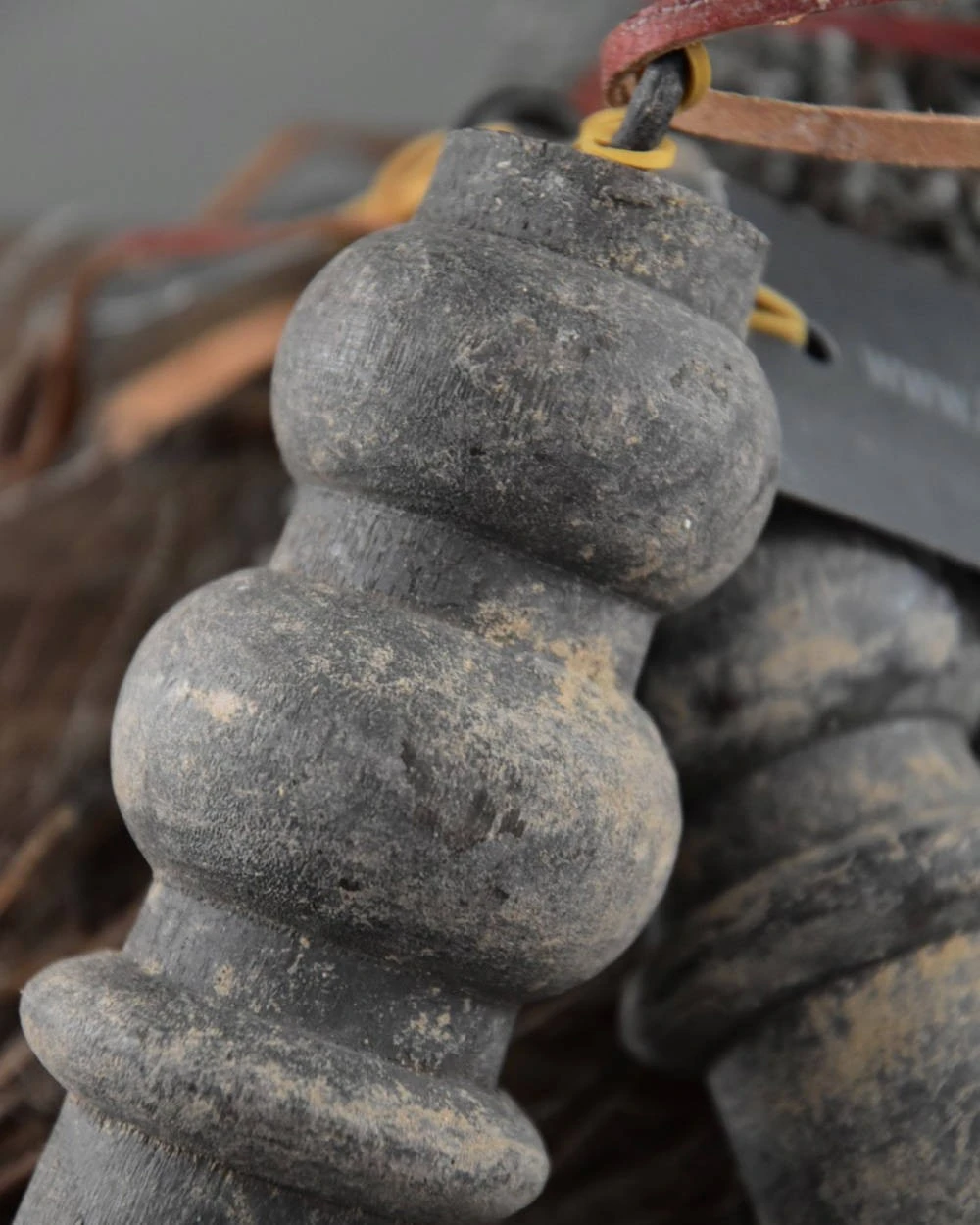 Toefhanger – klos verouderd grijs. Deze stoere sobere houten toefhanger heeft een leren koord. Met deze klossen kunt u eindeloos decoreren, in een toef aan de kast of of de tafel met wat takken.