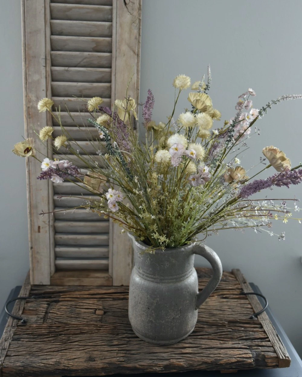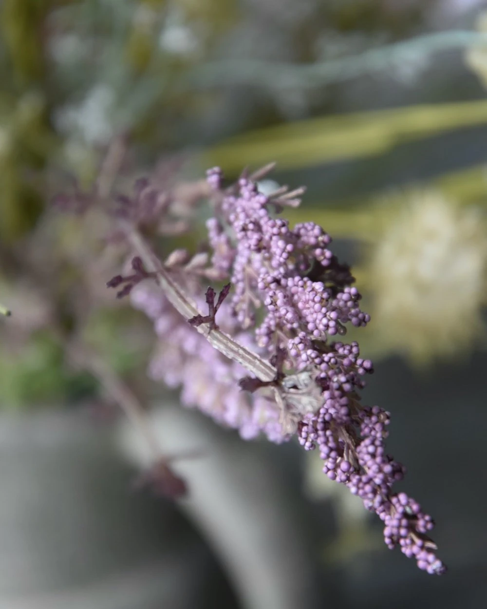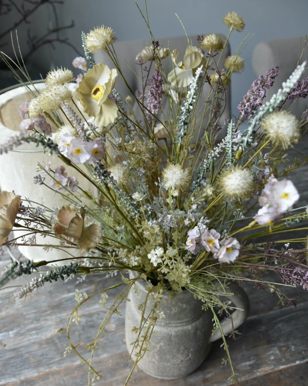 Veldboeket in pastel groenen, lila, paars en taupe, ‘zijdebloemen’ per stuk. Dit prachtige veldboeket van ‘zijde’ kunstbloemen is gemaakt van de mooie materialen en stoffen om een rijk effect te creëren. Het boeket is gemengd opgemaakt met verschillende pastellen in fijne soorten die we in het veld tegen komen. Het goed gevulde boeket is er een om lang plezier van te hebben en de zachte tinten lila, paars taupe en de groenen komen samen mooi tot hun recht. Al deze bloem soorten komen uit de collectie van het Deense merk IB Laursen.
