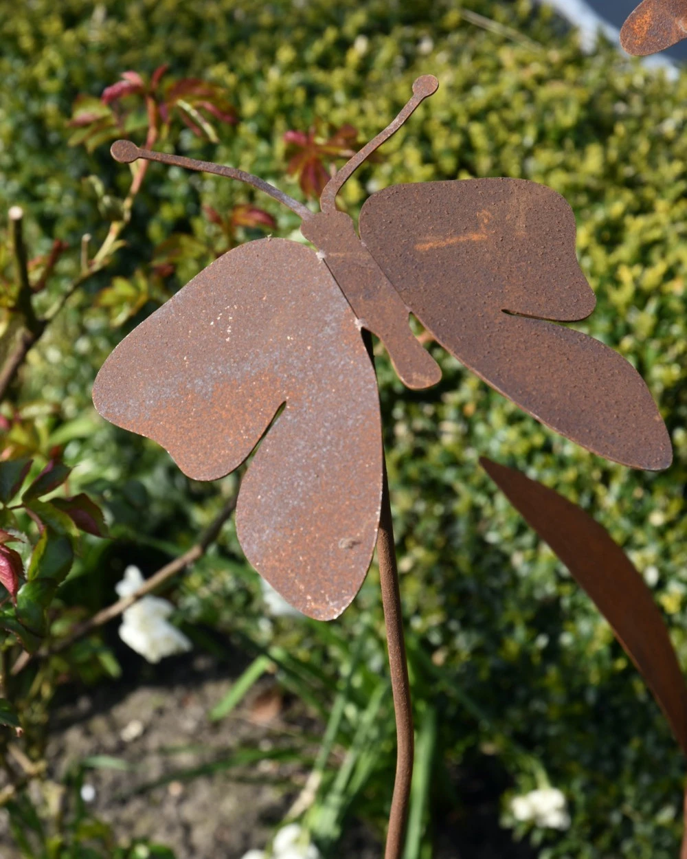 Vlinder op tuinprikker ecoroest. Deze leuke vlinder staat op een tuinprikker en is van ecoroest. U kunt de vlinder zo in de tuin steken en leuk combineren met de tuin bloemen. De vleugels zijn nog voorzichtig iets in de juiste positie te buigen (doe dit eenmalig, nadat de vlinder een poos in weer in wind staat kan het proces doorgaan en verhard het iets waardoor de buigzaamheid niet meer is aan te raden). Deze leuke vlinder geven een mooi silhouet in de tuin en passen prachtig tussen andere ecoroest bloemen en echte bloemen/planten in de tuin.