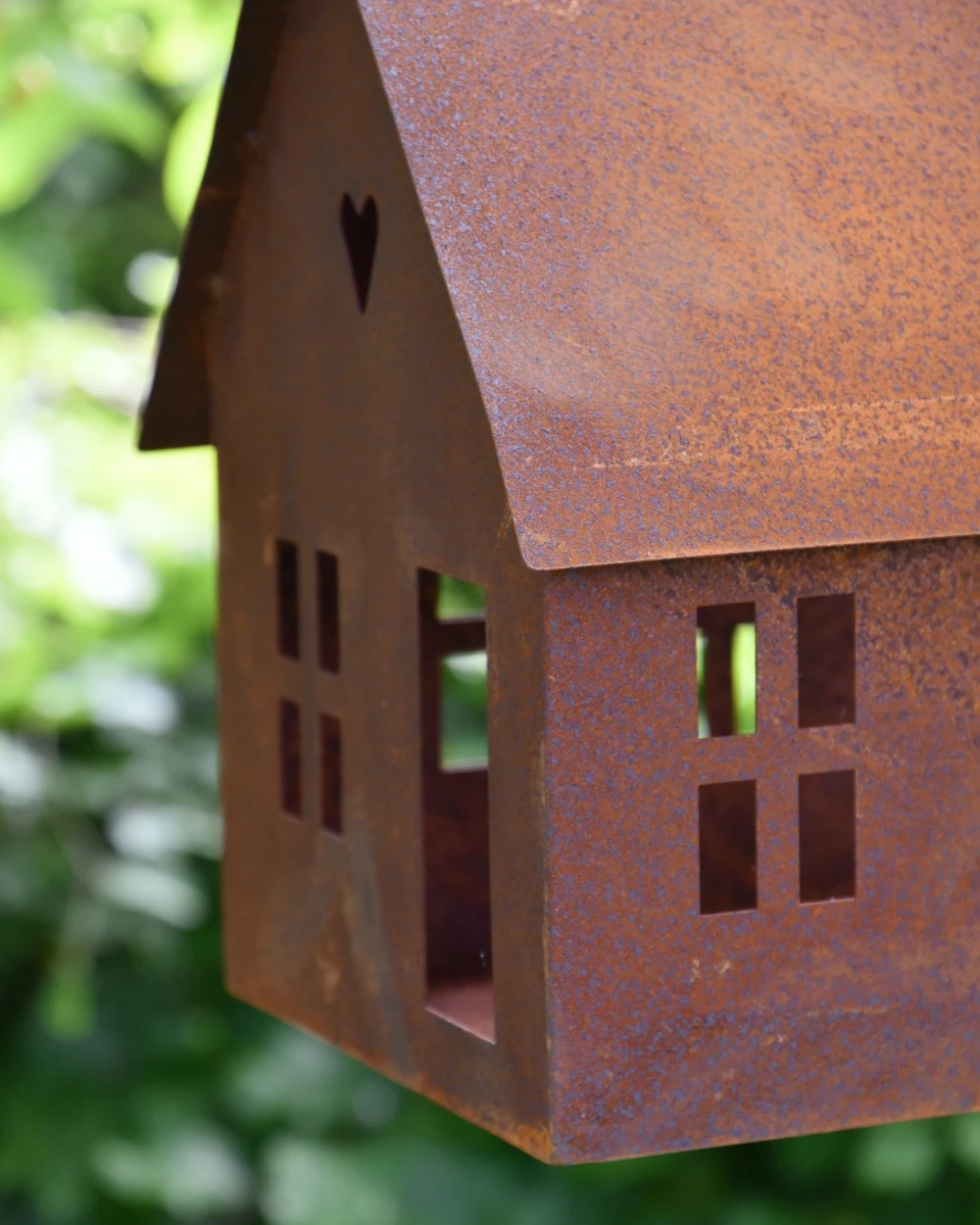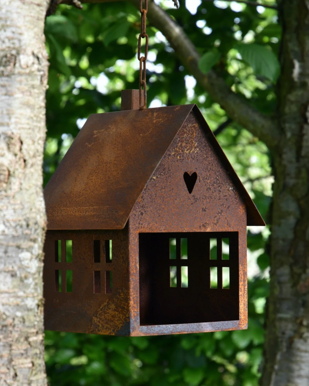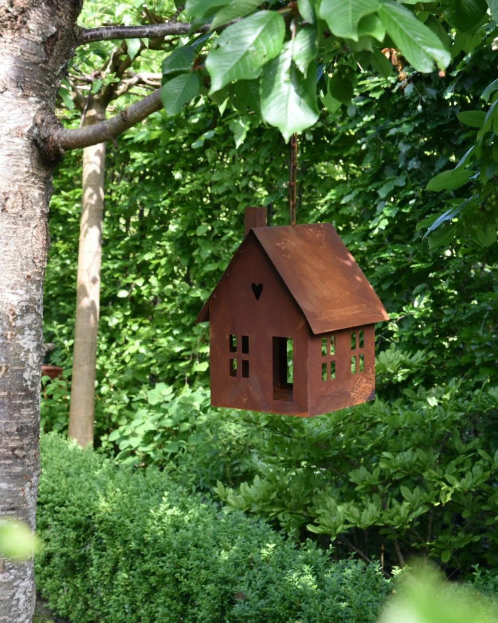 Vogel voeder huisje van roest metaal aan ketting. Dit leuke huis van metaal hangt aan een ketting met haak om op te hangen, het huis heeft ramen een dak, schoorsteen en een hartje in de top. Aan de achterzijde zit een ruim gat waar de vogeltjes gemakkelijk in kunnen om zo het ‘strooivoer’ wat in het huisje ligt gezellig op te eten met voor de vogels uitzicht door de open ramen….