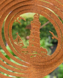 Wind vanger vuurtoren met bootje en meeuwen ecoroest. Deze leuke wind vanger van ecoroest is rond en heeft veel ronde spiralen en in het midden een uitgesneden afbeelding van een vuurtoren met een boot in het water en 3 vliegende meeuwen. Aan de bovenzijde zit een gaatje waar u een touwtje of ketting aan kunt doen om de windvanger op te hangen. Het geheel komt plat mee en u kunt het heel gemakkelijk uitvouwen zodat de wind zijn werk kan doen en de windvanger laat draaien in de wind.