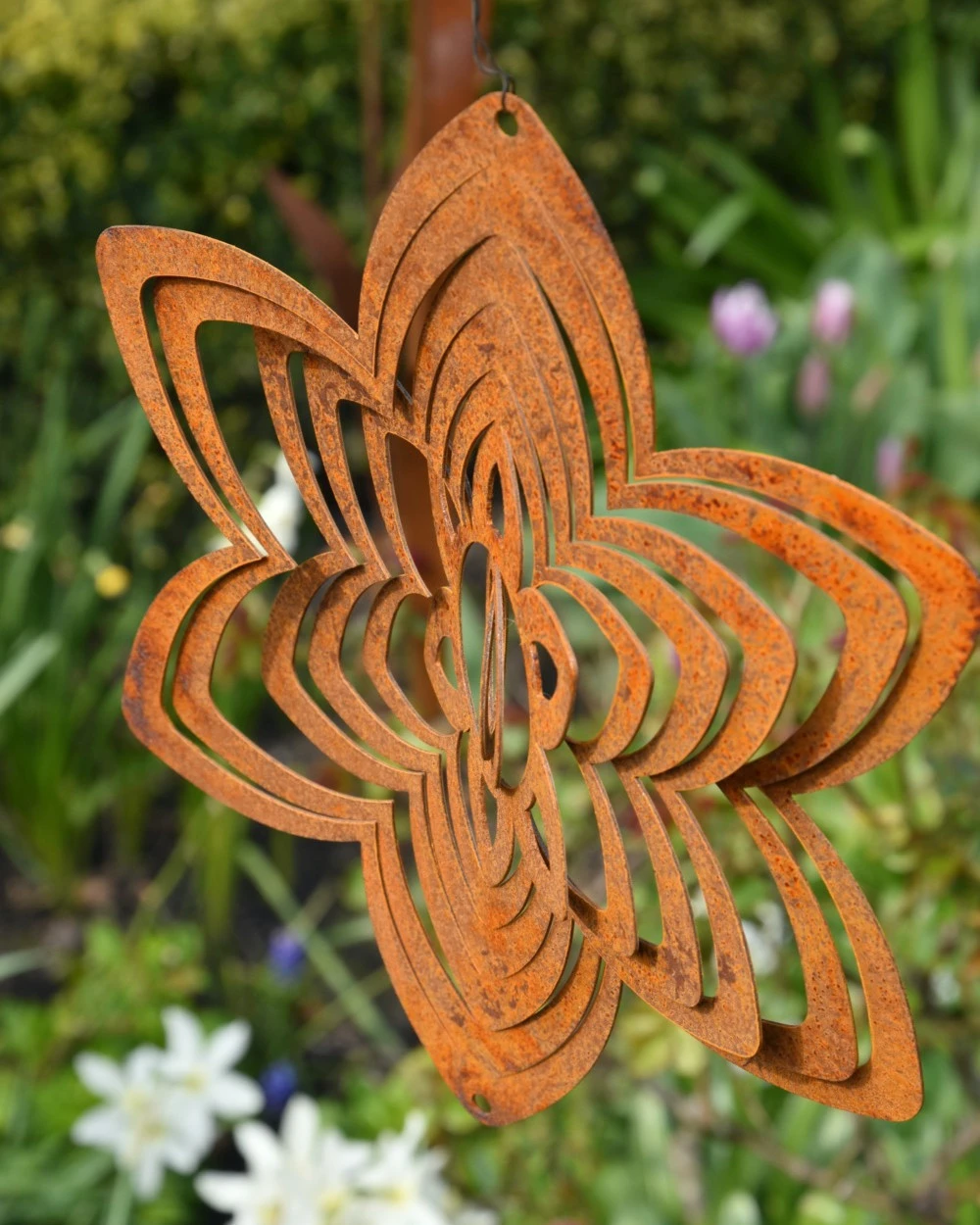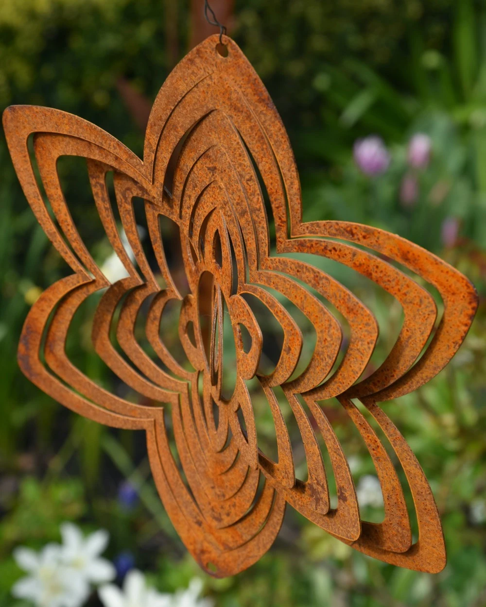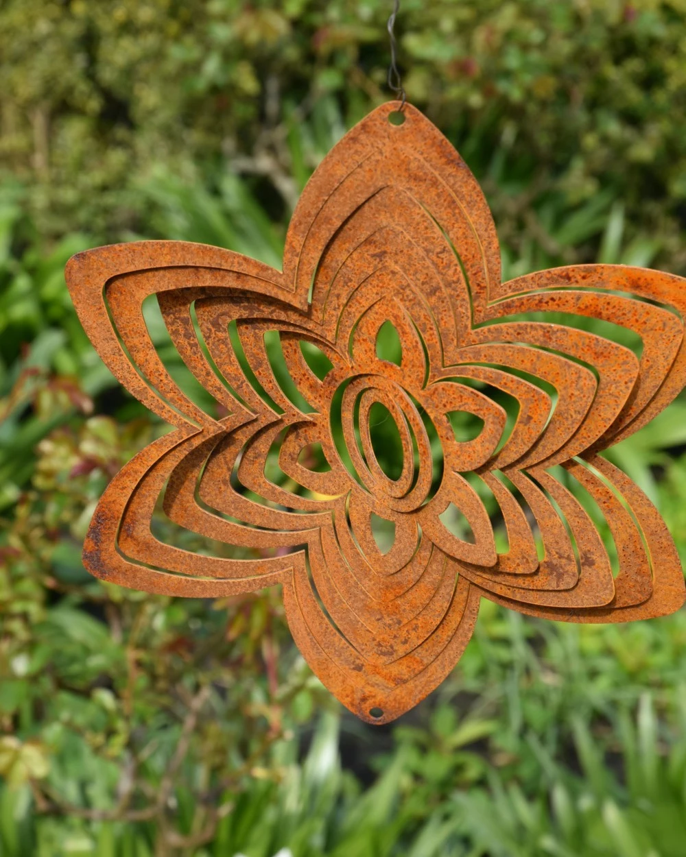 Windvanger van ecoroest Bloem spiraal. Deze mooie spiraalvormige bloem windvanger is van ecoroest gemaakt. Het bloem model kunt u als een spiraal openvouwen zodat de bloem in de wind gaat draaien. Aan de boven en onderzijde zit een klein gaatje waar u een touwtje, koord of kettinkje aan vast kunt maken zodat hij in de tuin kan worden opgehangen. Deze leuke tuindecoratie zal door de wind gaan draaien en zo een gezellig beeld geven.