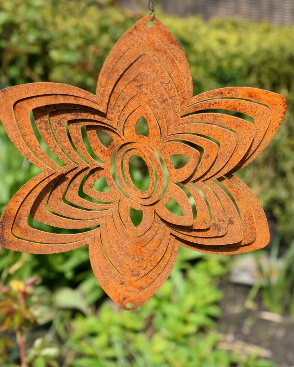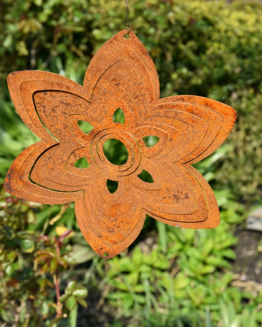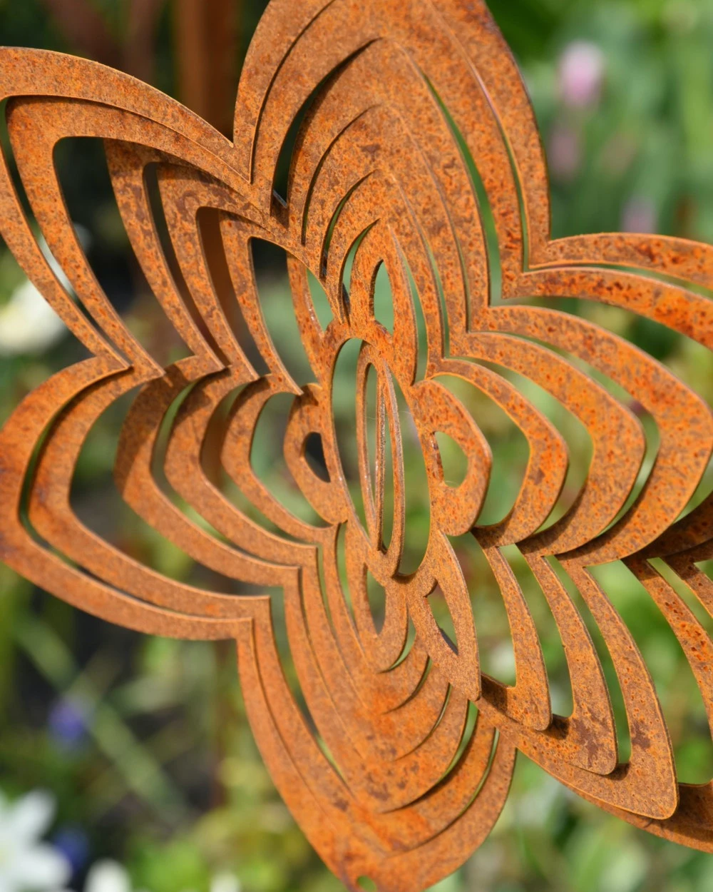 Windvanger van ecoroest Bloem spiraal. Deze mooie spiraalvormige bloem windvanger is van ecoroest gemaakt. Het bloem model kunt u als een spiraal openvouwen zodat de bloem in de wind gaat draaien. Aan de boven en onderzijde zit een klein gaatje waar u een touwtje, koord of kettinkje aan vast kunt maken zodat hij in de tuin kan worden opgehangen. Deze leuke tuindecoratie zal door de wind gaan draaien en zo een gezellig beeld geven.
