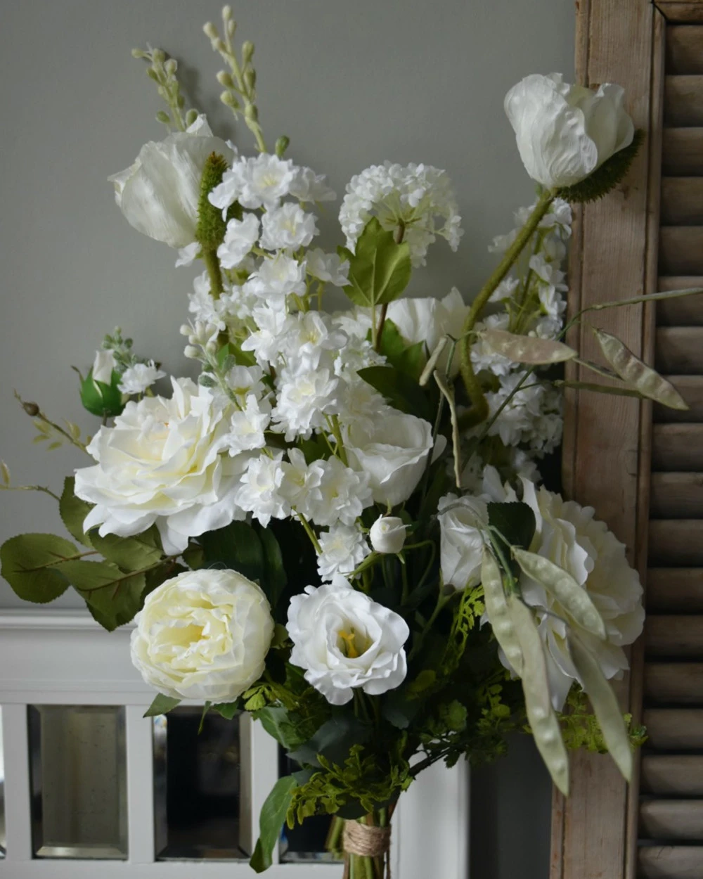 Zijde boeket gelaagd met witte bloemen. Dit prachtige boeket van mooie witte zijde/kunst bloemen is gelaagd opgemaakt waarddoor alle bloemen volledig tot zijn recht komen en ook elke zijde van het boeket even interesant is. Het boeket is opgemaakt met grote witte tuinrozen, Delphinium/Riddersporen, Papavers/Klaprozen, Lisianthus, Venus varen, Pioenrozen, Sneeuwballen/Viburnum en sier erwten. U kunt het boeket zo op een mooie vaas/krik zetten en heel lang genieten van dit prachtige exemplaar.Â