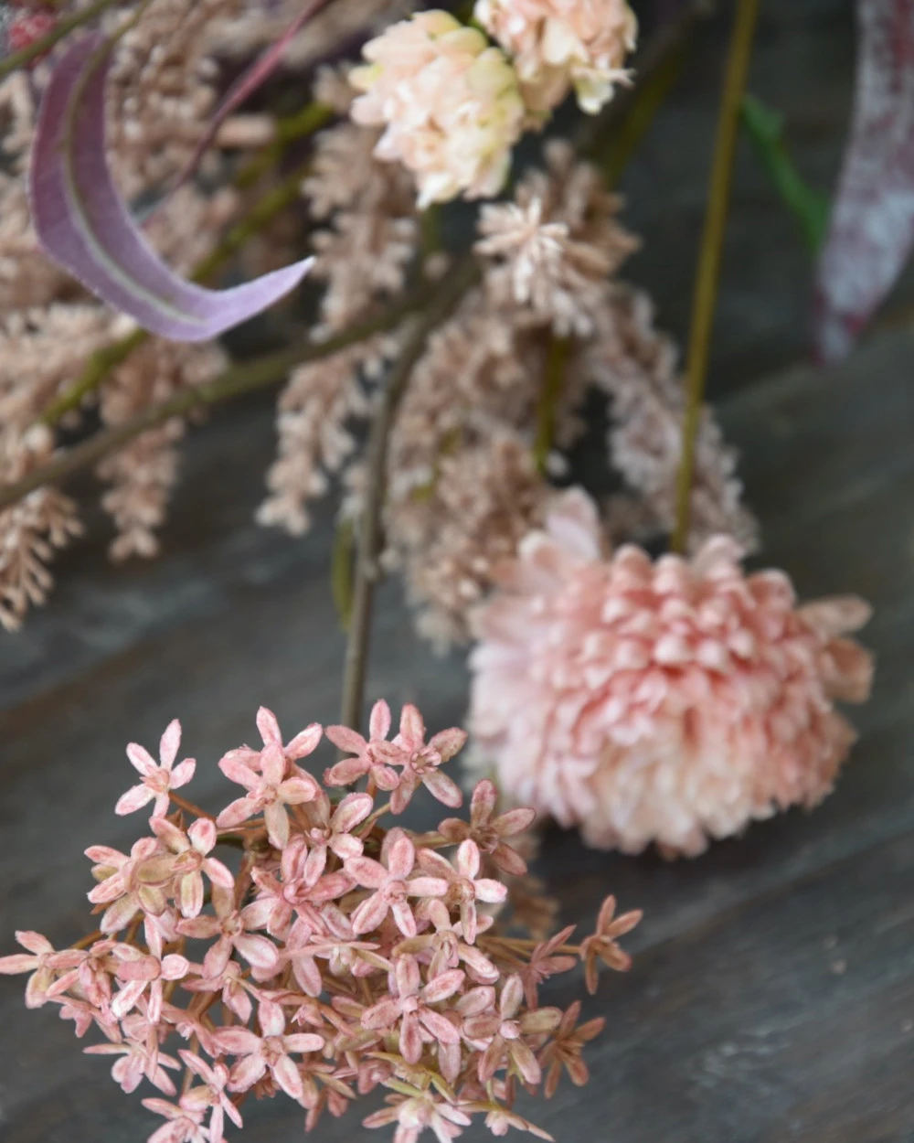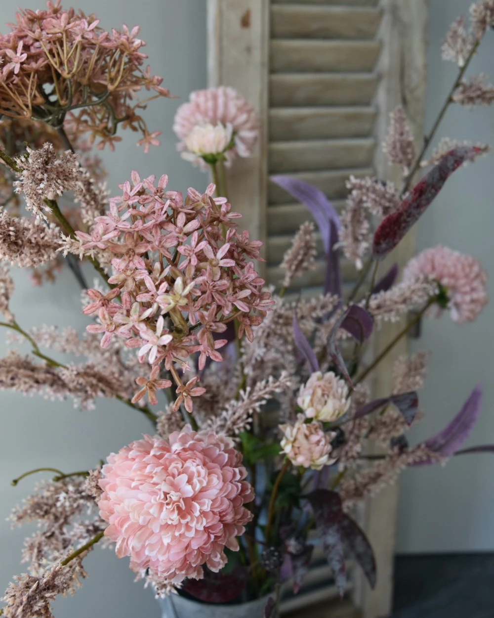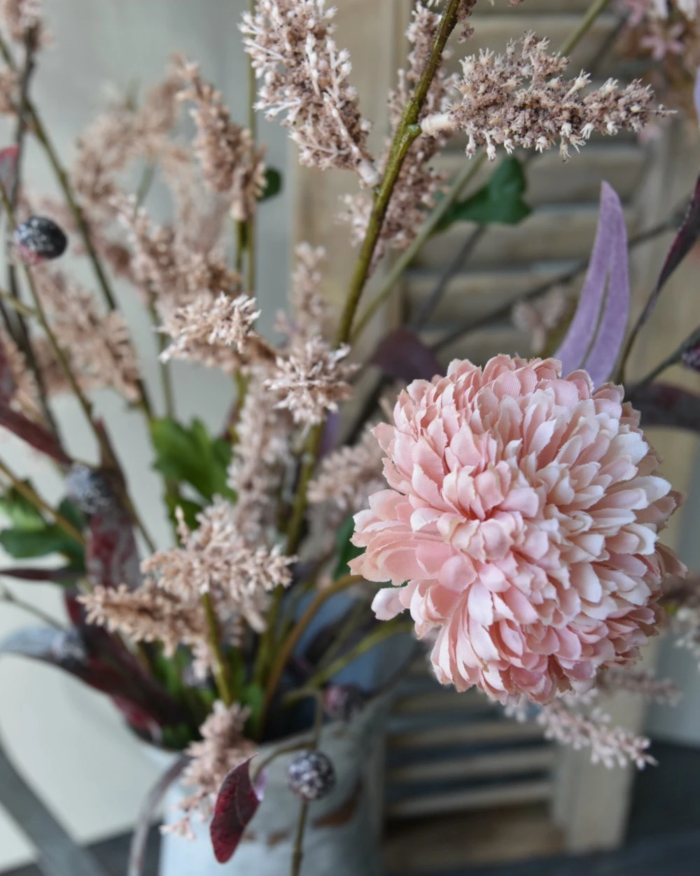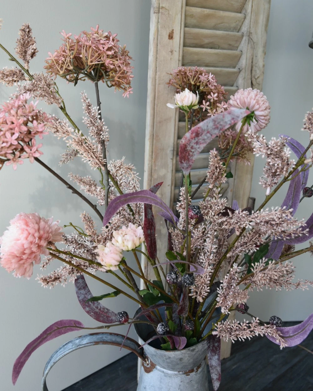 Zijde pluk boeket met Vlier en Wilgen bloesem, Eucalyptus en Chrysanten. Dit prachtige lange kunst/zijde boeket is in roze tinten en heeft o.a. Vlier bloesem, Wilgen bloesem, Dubbele Chrysanten en bordeaux rood Eucalyptus blad. Het boeket is in verschillende hoogtes zodat alle bloemen goed tot zijn recht komen. U kunt het boeket op een hoge ‘ballon’ vaas, kan of pot zetten met een smalle hals zodat de takken mooi wijds en sierlijk kunnen pronken. De takken hebben in de dikkere delen vooral een ijzerdraad als kern waardoor ze nog in de voor u juiste positie gebogen kunnen worden.