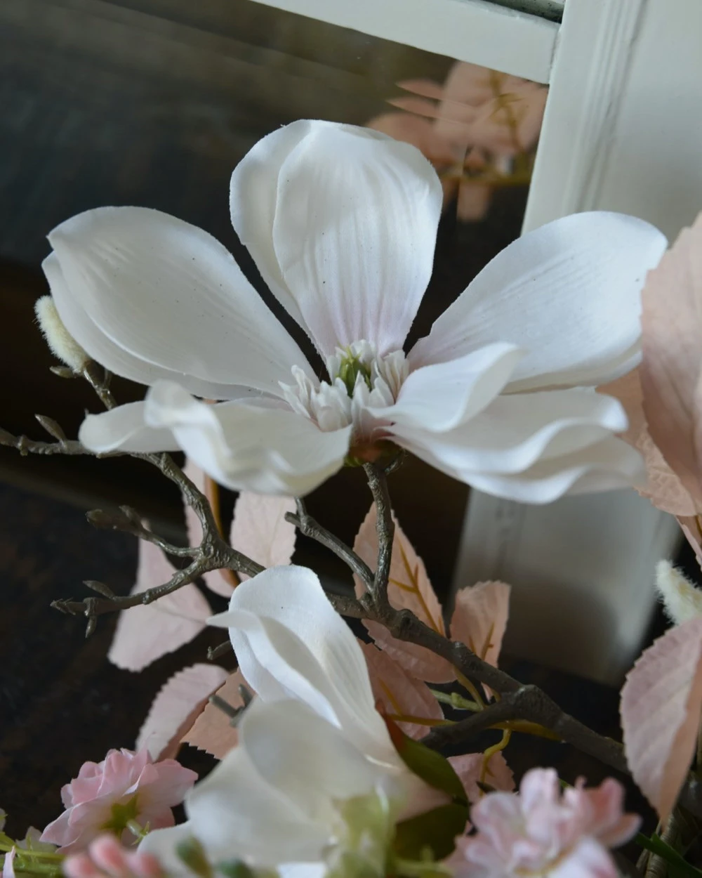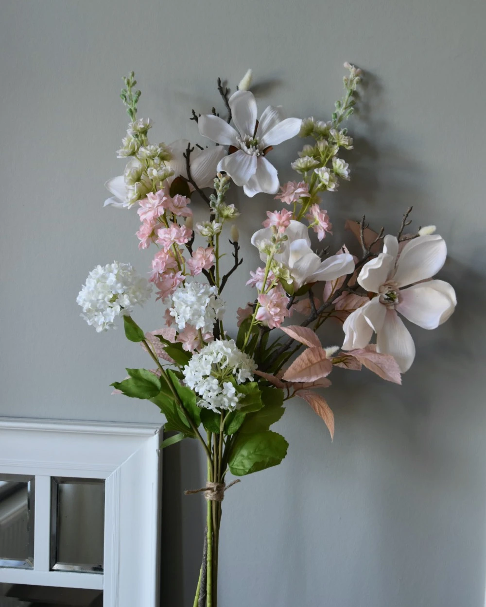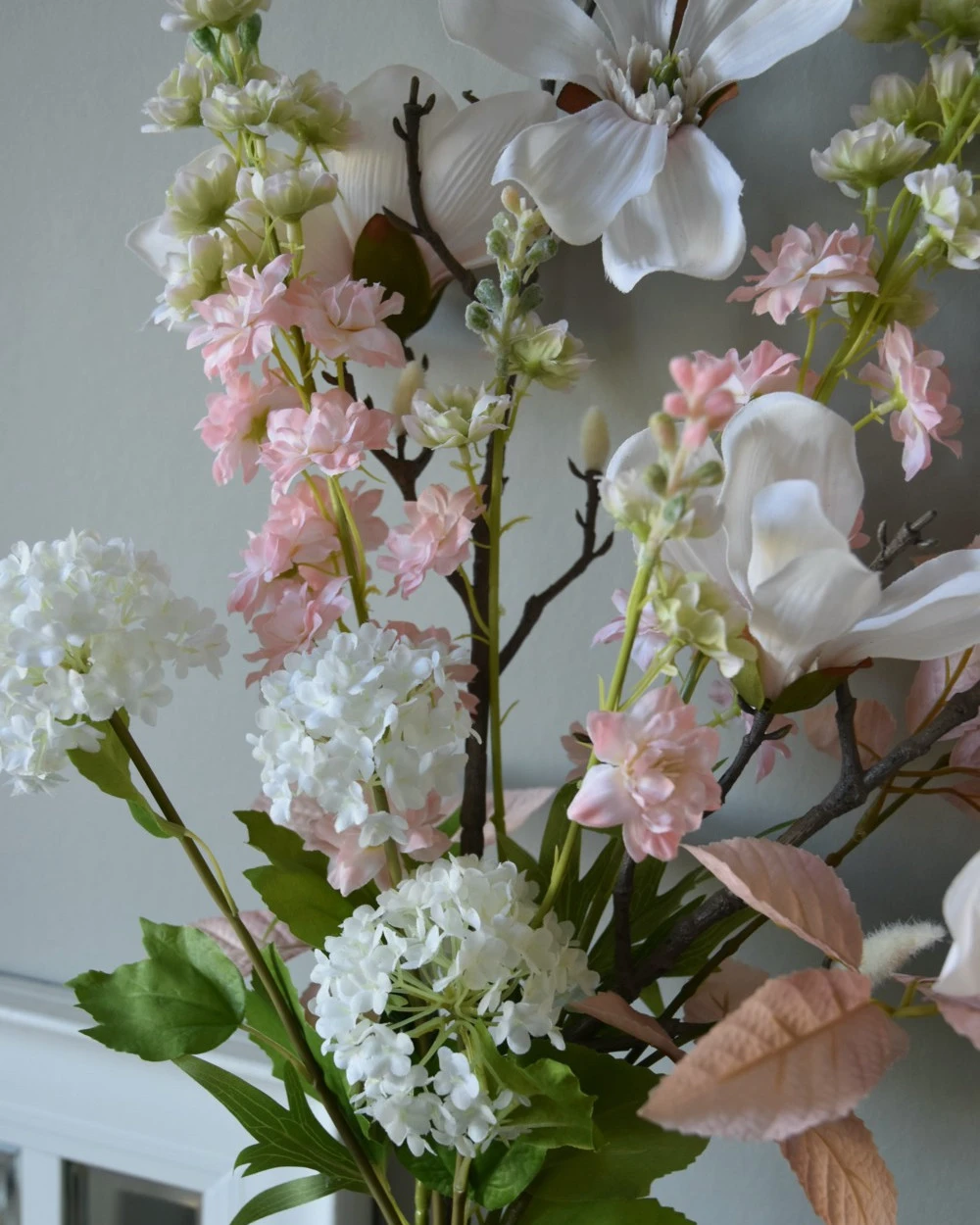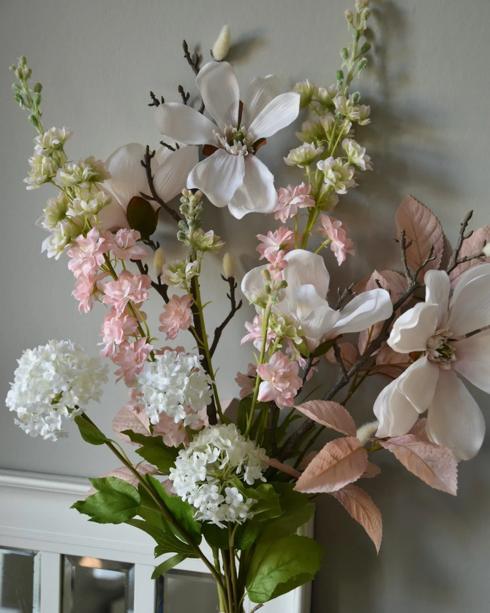 Zijde plukboeket in poeder tinten wit en roze. Dit prachtige plukboeket in poeder tinten roze en wit is eenzijdig opgemaakt en past heel mooi op een hoge fles of pot met smalle hals. Het boeket met lente en zomer bloeiers bestaat uit Magnolia, Delphinium, Sneeuwbal/Viburnum en blad. U kunt het boeket altijd nog korter knippen of de stelen ombuigen op de gewenste lengte en ook zijn de bloemen nog voorzichtig iets te buigen in de gewenste positie. Het kan zijn dat wij de onderkant van de stelen gebogen versturen voor vervoer.Â